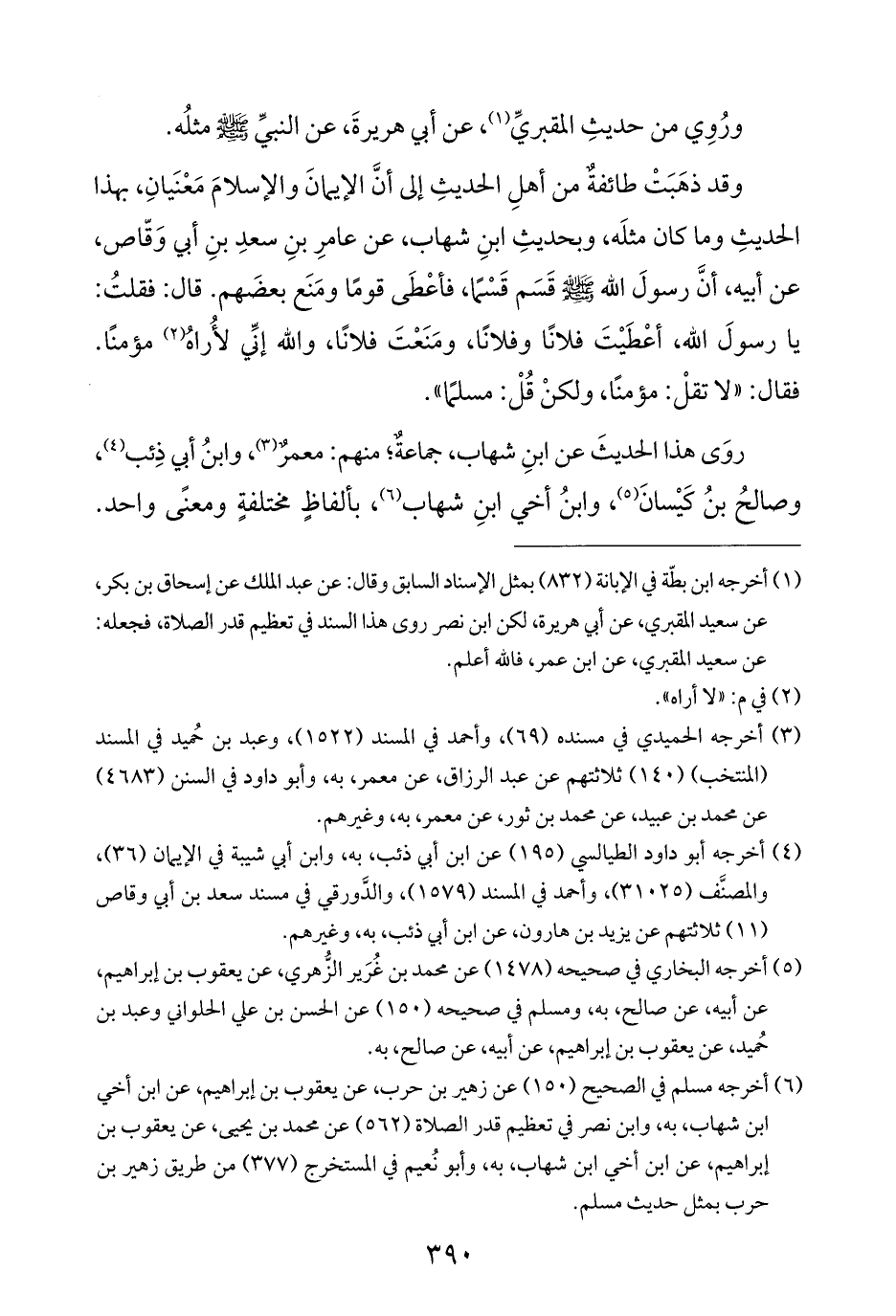 وقد ذهَبَتْ طائفةٌ من أهلِ الحديثِ إلى أنَّ الإيمانَ والإسلامَ مَعْنَيانِ، بهذا الحديثِ وما كان مثلَه، وبحديثِ ابنِ شهاب، عن عامرِ بنِ سعدِ بنِ أبي وَقّاص، عن أبيه، أنَّ رسولَ الله - صَلَّى اللهُ عَلَيْهِ وَسَلَّمَ - قَسَم قَسْمًا، فأعْطَى قومًا ومَنَع بعضَهم. قال: فقلتُ: يا رسولَ الله، أعْطَيْتَ فلانًا وفلانًا، ومَنَعْتَ فلانًا، واللّه إنِّي لأُراهُ (¬٢) مؤمنًا. فقال: "لا تقلْ: مؤمنًا، ولكنْ قُلْ: مسلمًا".