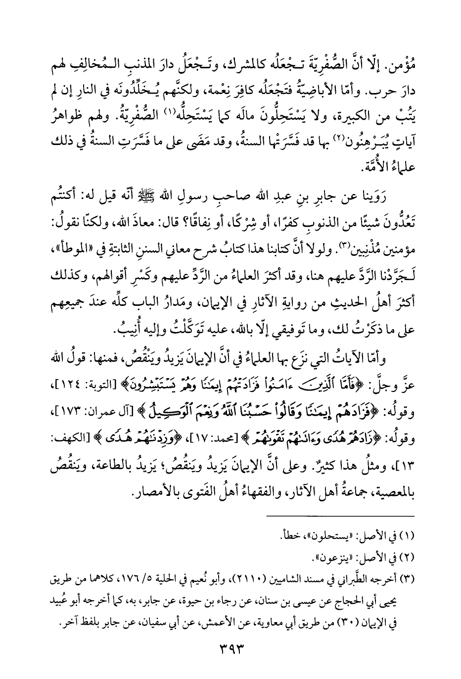 وأمّا الآياتُ التي نزَع بها العلماءُ في أنَّ الإيمانَ يَزيدُ وَينْقُصُ، فمنها: قولُ الله عزَّ وجلَّ: {فَأَمَّا الَّذِينَ آمَنُوا فَزَادَتْهُمْ إِيمَانًا وَهُمْ يَسْتَبْشِرُونَ} [التوبة: ١٢٤]، وقولُه: {فَزَادَهُمْ إِيمَانًا وَقَالُوا حَسْبُنَا اللَّهُ وَنِعْمَ الْوَكِيلُ} [آل عمران: ١٧٣]، وقولُه: {زَادَهُمْ هُدًى وَآتَاهُمْ تَقْوَاهُمْ} [محمد: ١٧]، {وَزِدْنَاهُمْ هُدًى} [الكهف: ١٣]، ومثلُ هذا كثيرٌ. وعلى أنَّ الإيمانَ يَزيدُ ويَنقُصُ؛ يَزيدُ بالطاعة، ويَنقُصُ بالمعصية، جماعةُ أهل الآثار، والفقهاءُ أهلُ الفَتوى بالأمصار.