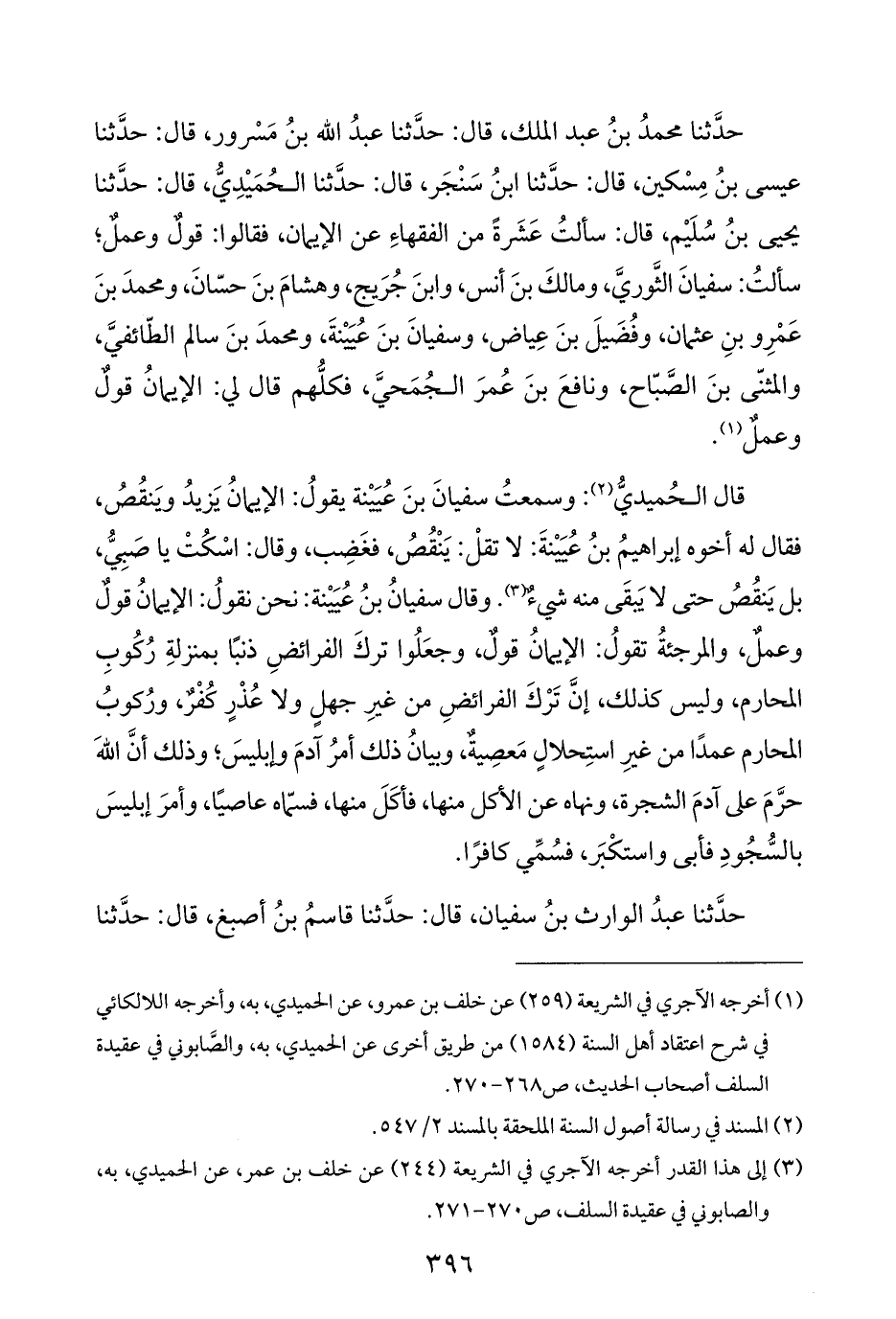 حَدَّثَنَا محمدُ بنُ عبد الملك، قال: حَدَّثَنَا عبدُ الله بنُ مَسْرور، قال: حَدَّثَنَا عيسى بنُ مِسْكين، قال: حَدَّثَنَا ابنُ سَنْجَر، قال: حَدَّثَنَا الحُمَيْدِيُّ، قال: حَدَّثَنَا يحيى بنُ سُلَيْم، قال: سألتُ عَشَرةً من الفقهاءِ عن الإيمان، فقالوا: قولٌ وعملٌ؟ سألتُ: سفيانَ الثَّوريَّ، ومالكَ بنَ أنس، وابنَ جُرَيج، وهشامَ بنَ حسّانَ، ومحمدَ بنَ عَمْرِو بنِ عثمان، وفُضَيلَ بنَ عِياض، وسفيانَ بنَ عُيَيْنةَ، ومحمدَ بنَ سالم الطّائفيَّ، والمثنّى بنَ الصَّبّاح، ونافعَ بنَ عُمرَ الجُمَحيَّ، فكلُّهم قال لي: الإيمانُ قولٌ وعملٌ (¬١).