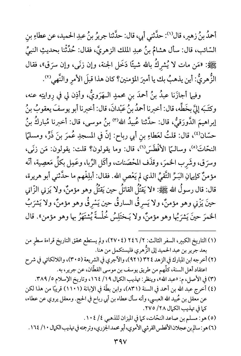 أحمدُ بنُ زهير، قال (¬١): حدَّثني أبي، قال: حَدَّثَنَا جريرُ بنُ عبدِ الحميد، عن عطاءِ بنِ السّائب، قال: سأل هشامُ بنُ عبدِ الملك الزهريَّ، فقال: حُدِّثْنا بحديثِ النبيِّ - صَلَّى اللهُ عَلَيْهِ وَسَلَّمَ -: "مَن مات لا يُشرِكُ باللّه شيئًا دَخَل الجَنَّة، وإن زنَى، وإن سرَق"، فقال الزُّهريُّ: أين يذهبُ بك يا أميرَ المؤمنين؟ كان هذا قبلَ الأمرِ والنَّهي (¬٢).