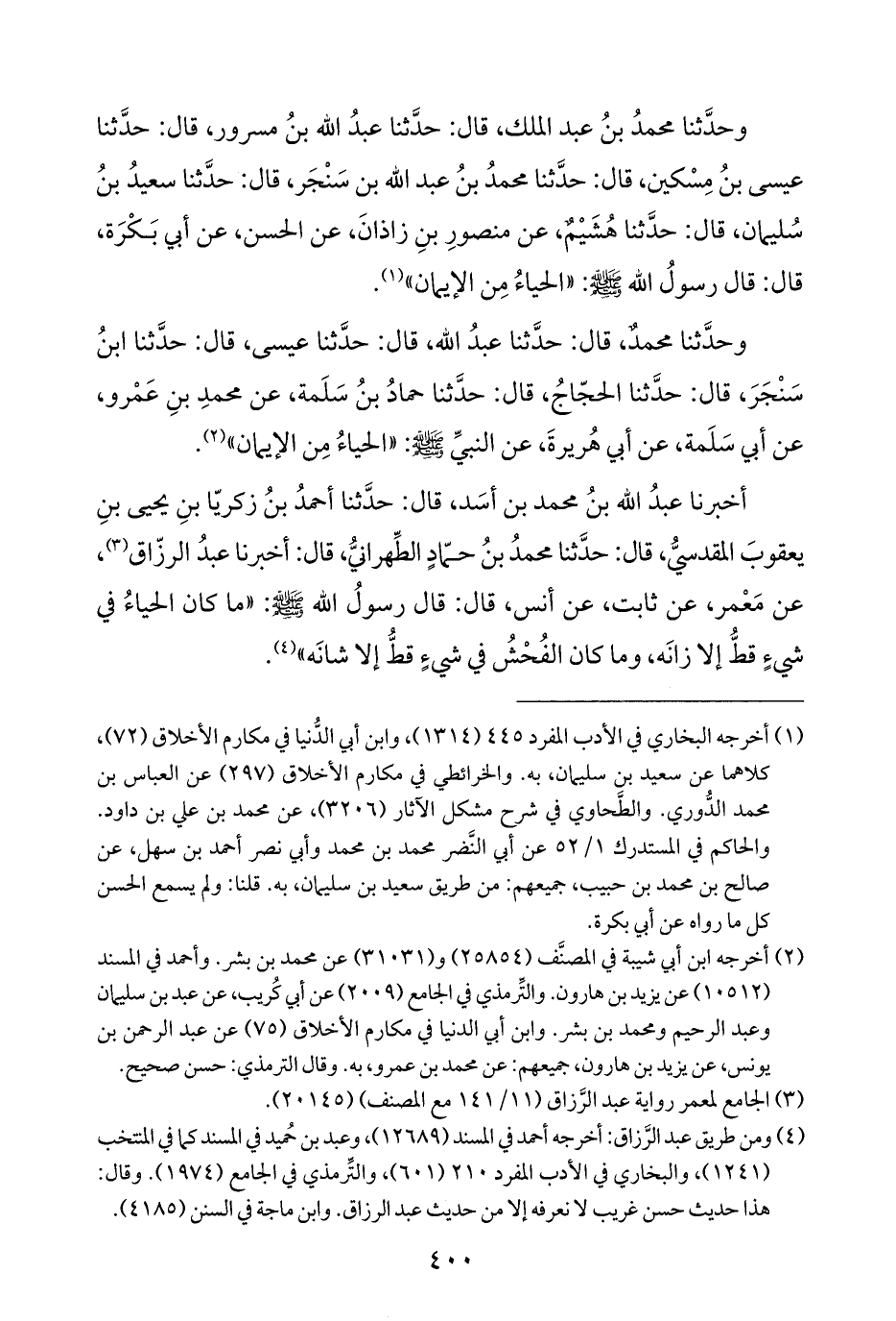وحَدَّثَنَا محمدُ بنُ عبد الملك، قال: حَدَّثَنَا عبدُ الله بنُ مسرور، قال: حَدَّثَنَا عيسى بنُ مِسْكين، قال: حَدَّثَنَا محمدُ بنُ عبد الله بن سَنْجَر، قال: حَدَّثَنَا سعيدُ بنُ سُليمان، قال: حَدَّثَنَا هُشَيْم، عن منصورِ بنِ زاذانَ، عن الحسن، عن أبي بَكْرَة، قال: قال رسولُ الله - صَلَّى اللهُ عَلَيْهِ وَسَلَّمَ -: "الحياءُ مِن الإيمان" (¬١).