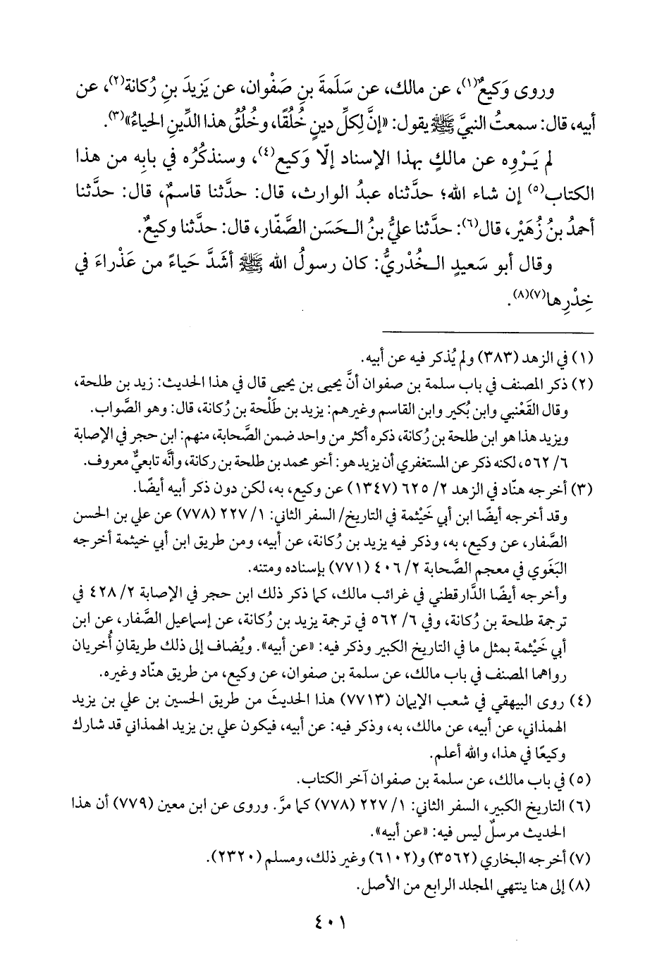 وأخرجه أيضًا الدَّارقطني في غرائب مالك، كما ذكر ذلك ابن حجر في الإصابة ٢/ ٤٢٨ في ترجمة طلحة بن رُكانة، وفي ٦/ ٥٦٢ في ترجمة يزيد بن رُكانة، عن إسماعيل الصَّفار، عن ابن أبي خَيْثمة بمثل ما في التاريخ الكبير وذكر فيه: "عن أبيه". ويُضاف إلى ذلك طريقانِ أُخريان رواهما المصنّف في باب مالك، عن سلمة بن صفوان، عن وكيع، من طريق هنّاد وغيره.