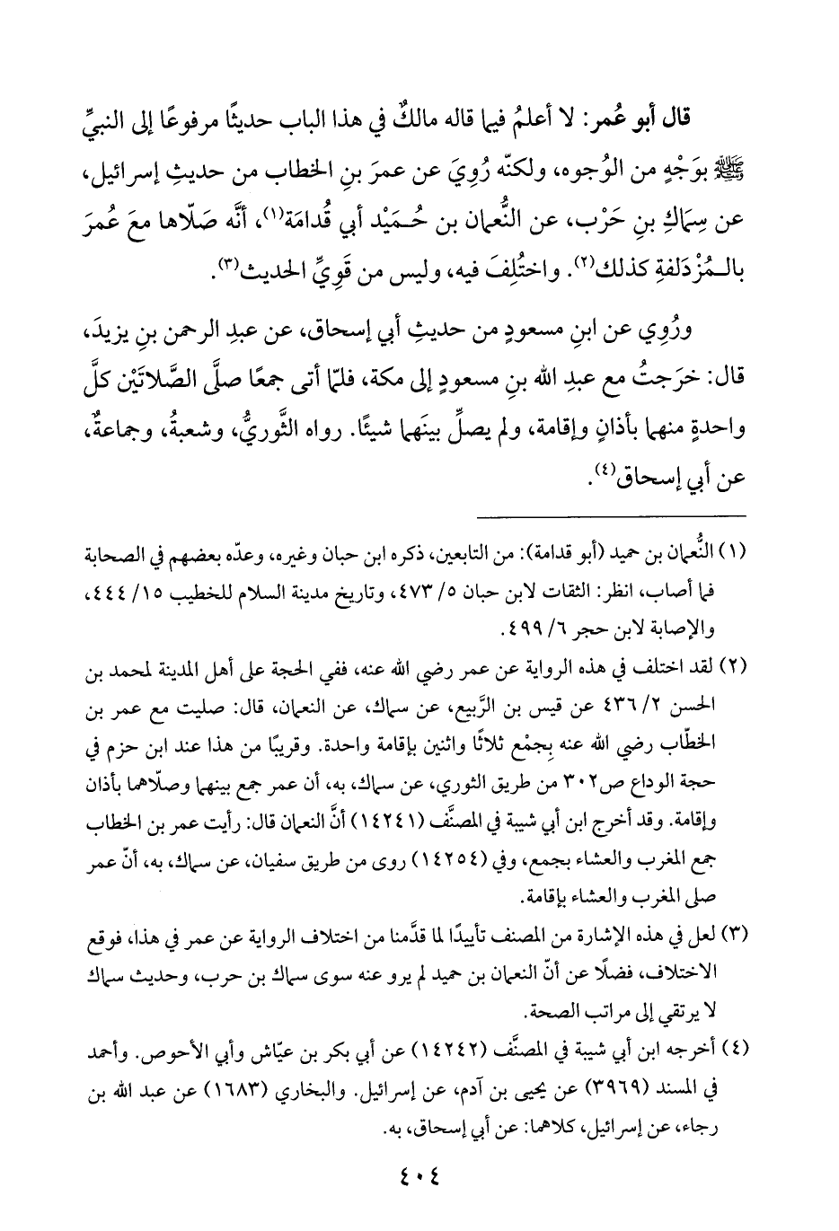 قال أبو عُمر: لا أعلمُ فيما قاله مالكٌ في هذا الباب حديثًا مرفوعًا إلى النبيِّ - صَلَّى اللهُ عَلَيْهِ وَسَلَّمَ - بوَجْهٍ من الوُجوه، ولكنّه رُوِيَ عن عمرَ بنِ الخطاب من حديثِ إسرائيل، عن سِمَاكِ بنِ حَرْب، عن النُّعمان بن حُمَيْد أبي قُدامَة (¬١)، أنَّه صَلّاها معَ عُمرَ بالمُزْدَلفةِ كذلك (¬٢). واختُلِفَ فيه، وليس من قَوِيِّ الحديث (¬٣).