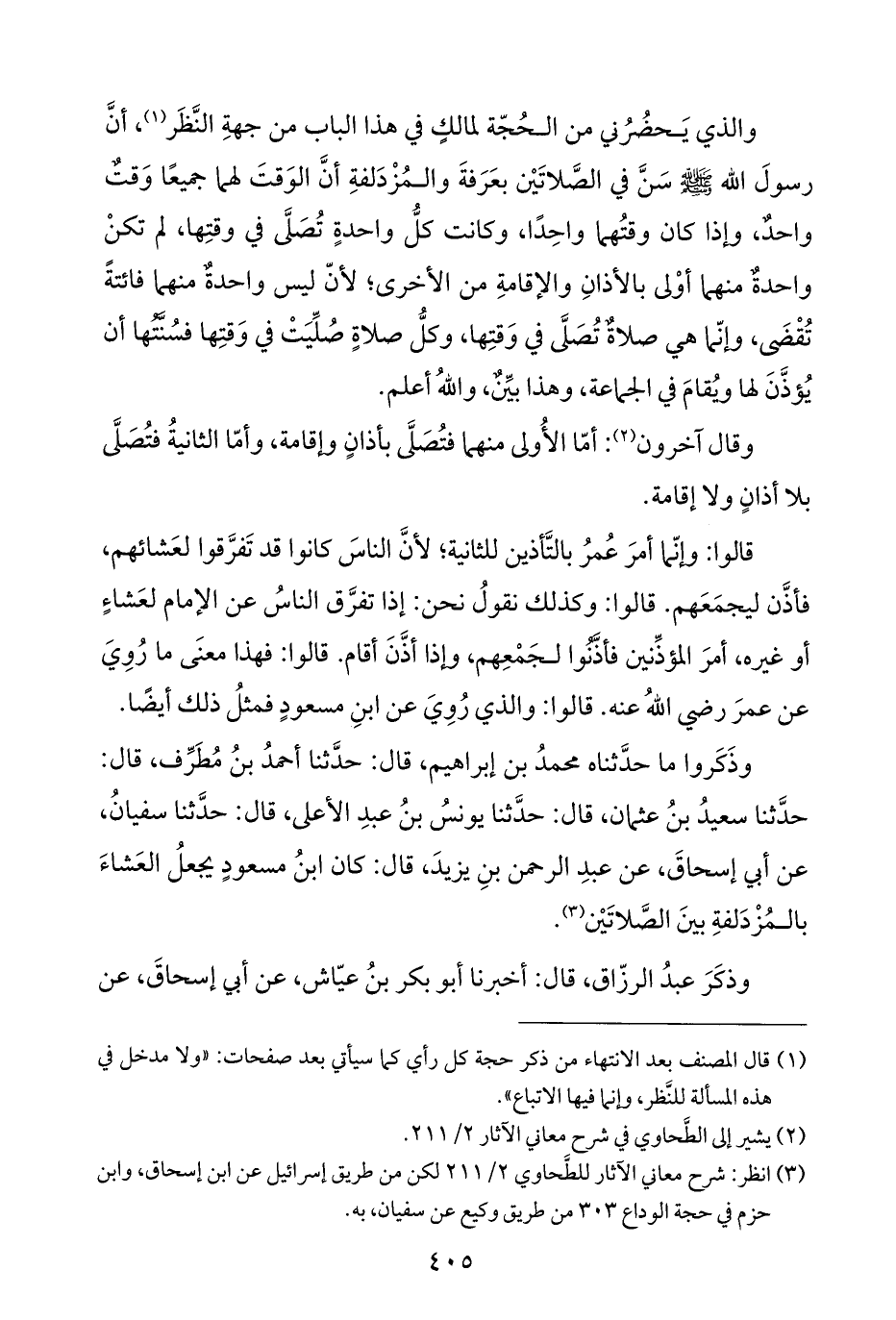 وذَكَروا ما حَدَّثَنَاه محمدُ بن إبراهيم، قال: حَدَّثَنَا أحمدُ بنُ مُطَرِّف، قال: حَدَّثَنَا سعيدُ بنُ عثمان، قال: حَدَّثَنَا يونسُ بنُ عبدِ الأعلى، قال: حَدَّثَنَا سفيانُ، عن أبي إسحاقَ، عن عبدِ الرَّحمن بنِ يزيدَ، قال: كان ابنُ مسعودٍ يجعلُ العَشاءَ بالمُزْدَلفةِ بينَ الصَّلاتَيْن (¬٣).