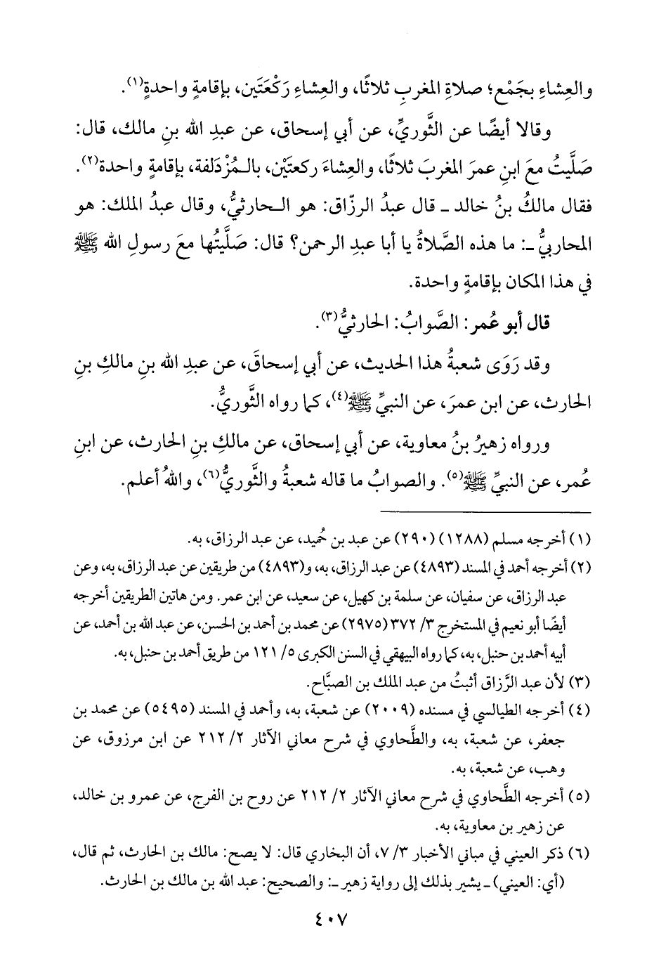 وقالا أيضًا عن الثَّوريِّ، عن أبي إسحاق، عن عبدِ الله بنِ مالك، قال: صَلَّيتُ معَ ابنِ عمرَ المغربَ ثلاثًا، والعِشاءَ ركعتَيْن، بالمُزْدَلفة، بإقامةٍ واحدة (¬٢). فقال مالكُ بنُ خالد - قال عبدُ الرزّاق: هو الحارثيُّ، وقال عبدُ الملك: هو المحاربيُّ -: ما هذه الصلاةُ يا أبا عبدِ الرَّحمن؟ قال: صَلَّيتُها معَ رسولِ الله - صَلَّى اللهُ عَلَيْهِ وَسَلَّمَ - في هذا المكان بإقامةٍ واحدة.