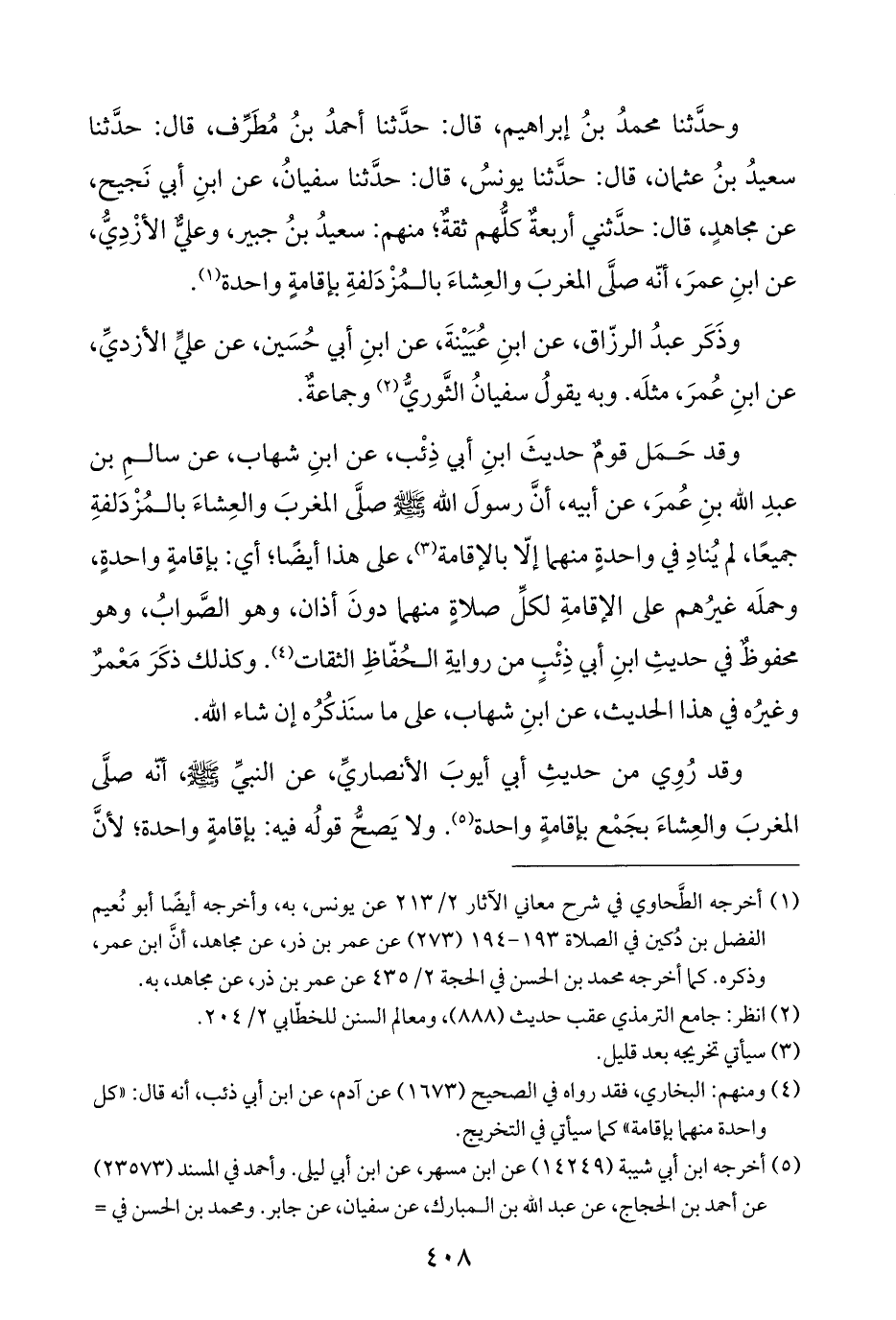 وحَدَّثَنَا محمدُ بنُ إبراهيم، قال: حَدَّثَنَا أحمدُ بنُ مُطَرِّف، قال: حَدَّثَنَا سعيدُ بنُ عثمان، قال: حَدَّثَنَا يونسُ، قال: حَدَّثَنَا سفيانُ، عن ابنِ أبي نَجيح، عن مجاهدٍ، قال: حدَّثني أربعةٌ كلُّهم ثقةٌ؛ منهم: سعيدُ بنُ جبير، وعليٌّ الأزْدِيُّ، عن ابنِ عمرَ، أنه صلَّى المغربَ والعِشاءَ بالمُزْدَلفةِ بإقامةٍ واحدة (¬١).