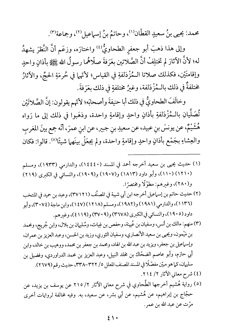 وخالَفَ الطحاويُّ في ذلك أبا حنيفةَ وأصحابَه؛ لأنّهم يقولون: إنَّ الصَّلاتَيْن تُصَلَّيانِ بالمُزْدَلفةِ بأذانٍ واحدٍ وإقامةٍ واحدة، وذهَبوا في ذلك إلى ما رَواه هُشَيْمٌ، عن يونسَ بنِ عبيد، عن سعيدِ بنِ جبير، عن ابنِ عمرَ، أنَّه جمع بينَ المغربِ والعِشاءِ بجَمْع بأذانٍ واحدٍ وإقامةٍ واحدة، ولم يجعَلْ بينَهما شيئًا (¬٥). قالوا: فكان