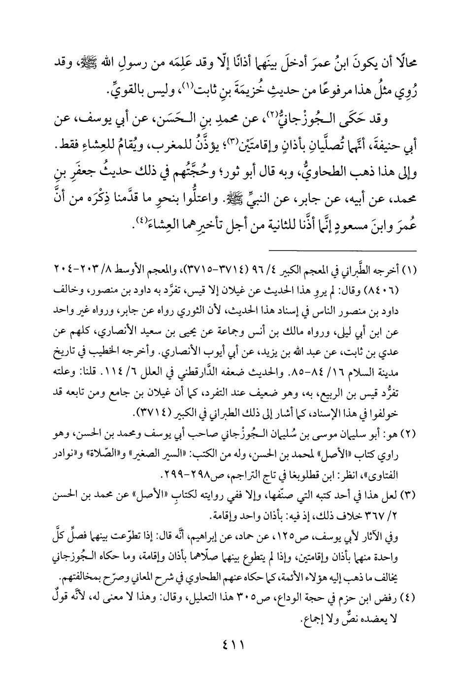وقد حَكَى الجُوزْجانيُّ (¬٢)، عن محمدِ بنِ الحَسَن، عن أبي يوسف، عن أبي حنيفةَ، أنَّهما تُصلَّيانِ بأذانٍ وإقامتَيْن (¬٣)، يؤذَّنُ للمغرب، ويُقامُ للعِشاءِ فقط. وإلى هذا ذهب الطحاويُّ، وبه قال أبو ثور؛ وحُجَّتُهم في ذلك حديثُ جعفَرِ بنِ محمد، عن أبيه، عن جابر، عن النبيِّ - صَلَّى اللهُ عَلَيْهِ وَسَلَّمَ -. واعتلُّوا بنحوِ ما قدَّمنا ذِكْرَه من أنَّ عُمرَ وابنَ مسعودٍ إنَّما أذَّنا للثانية من أجل تأخيرِهما العِشاءَ (¬٤).