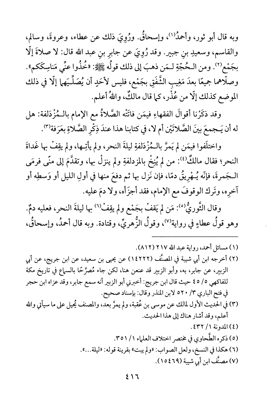 وبه قال أبو ثور، وأحمدُ (¬١)، وإسحاقُ. ورُوِيَ ذلك عن عطاء، وعروةَ، وسالم، والقاسم، وسعيدِ بنِ جبير. وقد رُوِيَ عن جابرِ بنِ عبد الله قال: لا صلاةَ إلّا بجَمْع (¬٢). ومن الحُجّةِ لمَن ذهبَ إلى ذلك قولُه - صَلَّى اللهُ عَلَيْهِ وَسَلَّمَ -: "خُذُوا عنِّي مَناسِكَكم". وصلّاهما جميعًا بعدَ مَغِيبِ الشَّفَقِ بجَمْع، فليس لأحَدٍ أن يُصَلِّيَهما إلّا في ذلك الموضع كذلك إلّا من عُذْر، كما قال مالكٌ، واللّهُ أعلم.