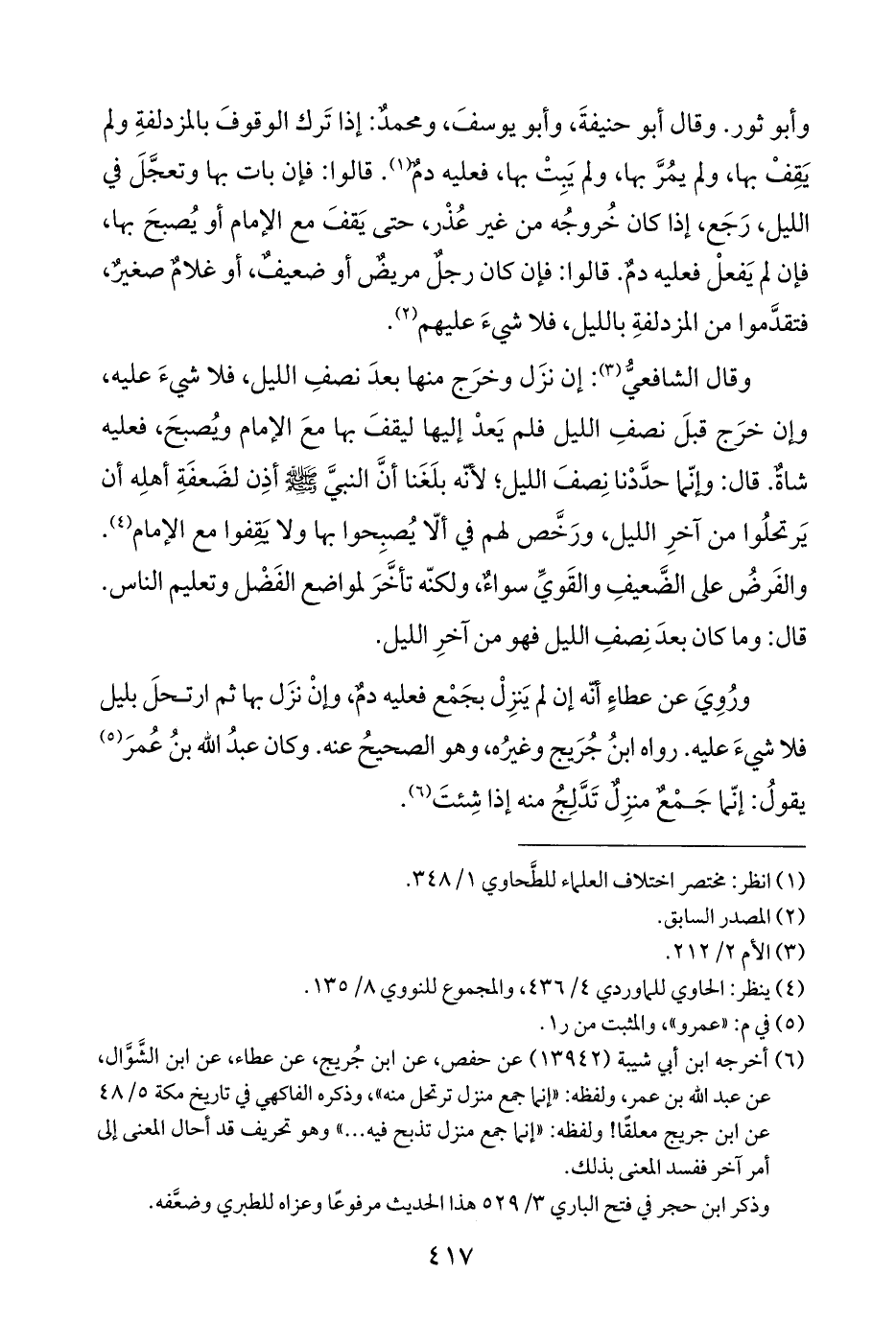 وأبو ثور. وقال أبو حنيفةَ، وأبو يوسفَ، ومحمدٌ: إذا تَرك الوقوفَ بالمزدلفةِ ولم يَقِفْ بها، ولم يمُرَّ بها، ولم يَبِتْ بها، فعليه دمٌ (¬١). قالوا: فإن بات بها وتعجَّلَ في الليل، رَجَع، إذا كان خُروجُه من غير عُذْر، حتى يَقفَ مع الإمام أو يُصبحَ بها، فإن لَمْ يَفعلْ فعليه دمٌ. قالوا: فإن كان رجلٌ مريضٌ أو ضعيفٌ، أو غلامٌ صغيرٌ فتقدَّموا من المزدلفةِ بالليل، فلا شيءَ عليهم (¬٢).