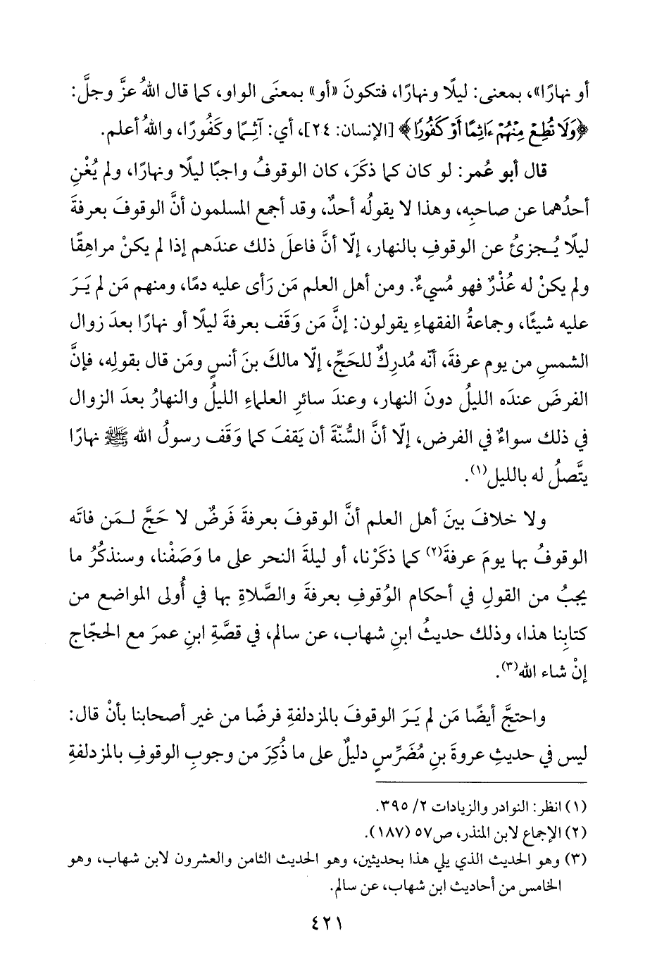 قال أبو عُمر: لو كان كما ذكَرَ، كان الوقوفُ واجبًا ليلًا ونهارًا، ولم يُغْنِ أحدُهما عن صاحبِه، وهذا لا يقولُه أحد، وقد أجمع المسلمون أنَّ الوقوفَ بعرفةَ ليلًا يُجزئُ عن الوقوفِ بالنهار، إلّا أنَّ فاعلَ ذلك عندَهم إذا لم يكنْ مراهِقًا ولم يكنْ له عُذْرٌ فهو مُسيءٌ ومن أهل العلم مَن رَأى عليه دمًا، ومنهم مَن لم يَرَ عليه شيئًا، وجماعةُ الفقهاءِ يقولون: إنَّ مَن وَقَف بعرفةَ ليلًا أو نهارًا بعدَ زوال الشمسِ من يوم عرفةَ، أنه مُدرِكٌ للحَجِّ، إلّا مالكَ بنَ أنسٍ ومَن قال بقولِه، فإنَّ الفرضَ عندَه الليلُ دونَ النهار، وعندَ سائرِ العلماءِ الليلُ والنهارُ بعدَ الزوال في ذلك سواءٌ في الفرض، إلّا أنَّ السُّنَّةَ أن يَقفَ كما وَقَف رسولُ الله - صلى الله عليه وسلم - نهارًا يتَّصلُ له بالليل (¬١).