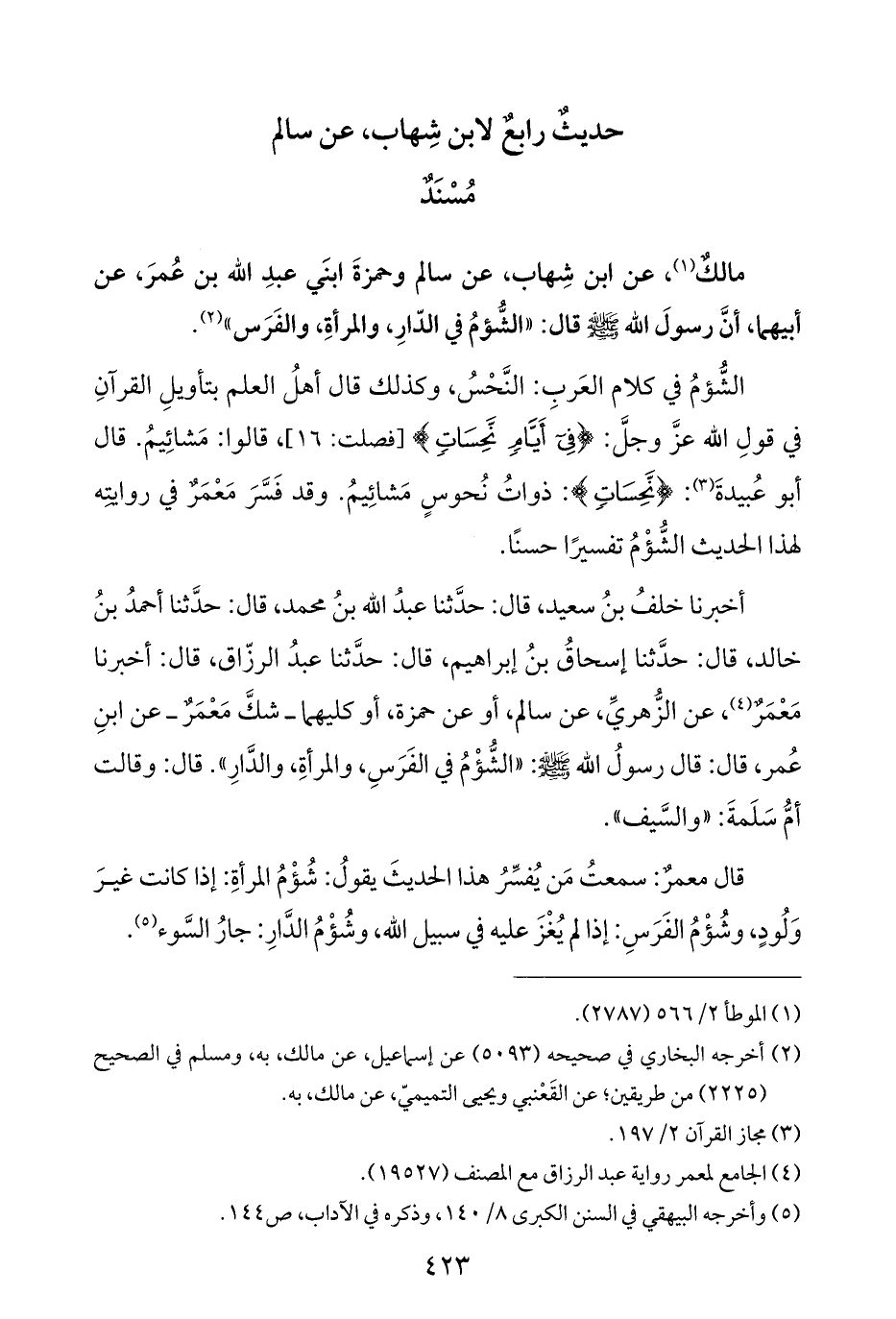 مالكٌ (¬١)، عن ابن شِهاب، عن سالم وحمزةَ ابنَي عبدِ الله بن عُمرَ، عن أبيهما، أنَّ رسولَ الله - صلى الله عليه وسلم - قال: "الشُّؤمُ في الدّارِ، والمرأةِ، والفَرَس" (¬٢).