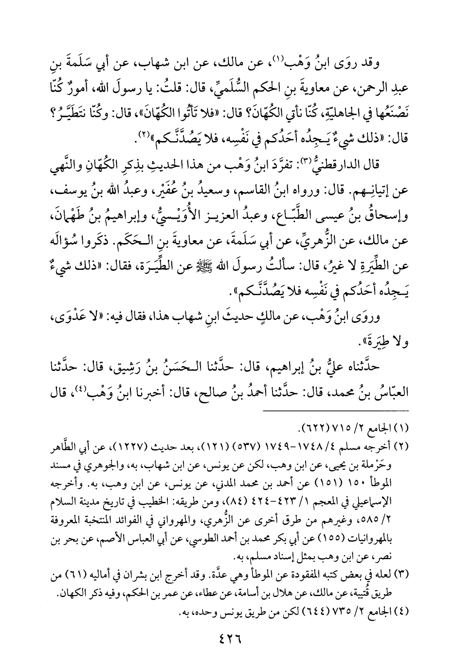 قال الدارقطنيُّ (¬٣): تفرَّدَ ابنُ وَهْب من هذا الحديثِ بذِكرِ الكُهّانِ والنَّهي عن إتيانِهم. قال: ورواه ابنُ القاسم، وسعيدُ بنُ عُفَيْر، وعبدُ الله بنُ يوسف، وإسحاقُ بنُ عيسى الطَّبّاع، وعبدُ العزيز الأُوَيْسيُّ، وإبراهيمُ بنُ طَهْمانَ، عن مالك، عن الزُّهريِّ، عن أبي سَلَمةَ، عن معاويةَ بنِ الحَكَم. ذكَروا سُؤالَه عن الطِّيَرةِ لا غيرُ، قال: سألتُ رسولَ الله - صلى الله عليه وسلم - عن الطِّيَرَة، فقال: "ذلك شيءٌ يَجِدُه أحَدُكم في نَفْسِه فلا يَصُدَّنَّكم".