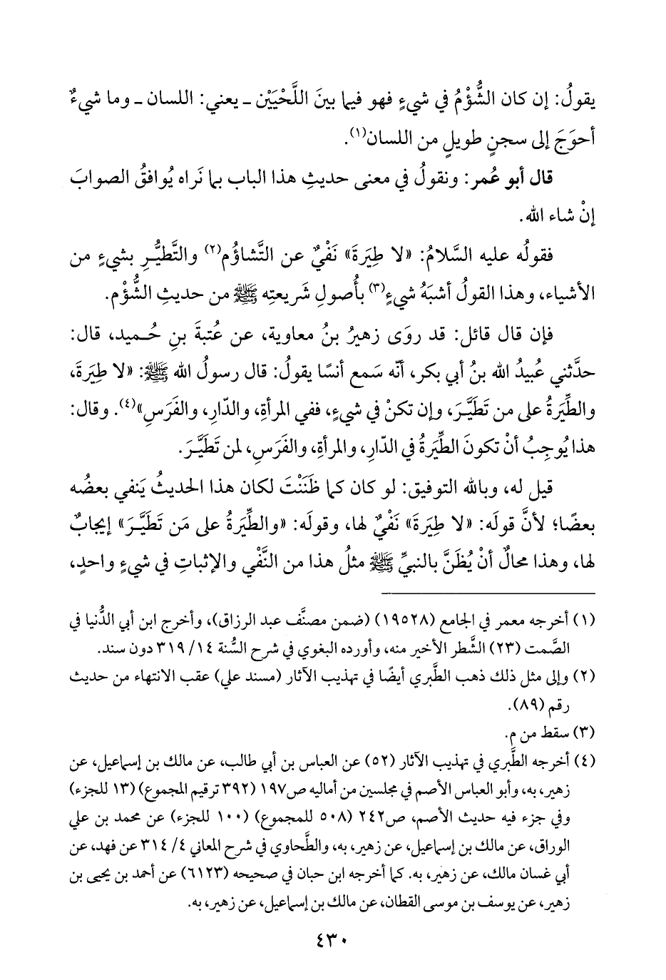 قيل له، وبالله التوفيق: لو كان كما ظَنَنْتَ لكان هذا الحديثُ يَنفي بعضُه بعضًا؛ لأنَّ قولَه: "لا طِيَرةَ" نَفْيٌ لها، وقولَه: "والطِّيَرةُ على مَن تَطَيَّرَ" إيجابٌ لها، وهذا محالٌ أنْ يُظَنَّ بالنبيِّ - صلى الله عليه وسلم - مثلُ هذا من النَّفْي والإثباتِ في شيءٍ واحدٍ،