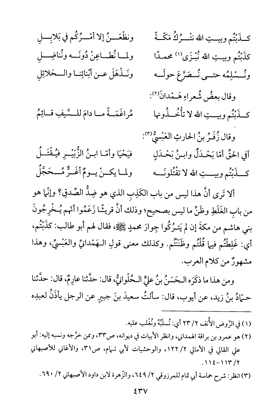 ألا تَرى أنَّ هذا ليس من باب الكَذِبِ الذي هو ضِدُّ الصِّدقِ؟ وإنّما هو من بابِ الغَلَطِ وظَنِّ ما ليس بصحيح، وذلك أنَّ قريشًا زَعَمُوا أنّهم يُخْرِجُونَ بني هاشم من مكةَ إن لم يَترُكُوا جِوارَ محمدٍ - صلى الله عليه وسلم -، فقال لهم أبو طالب: كذَبْتُم، أي: غَلِطْتُم فيما قُلْتُم وظَنَنْتُم. وكذلك معنى قولِ الهَمْدانيِّ والعَبْسيِّ، وهذا مشهورٌ من كلام العرب.
