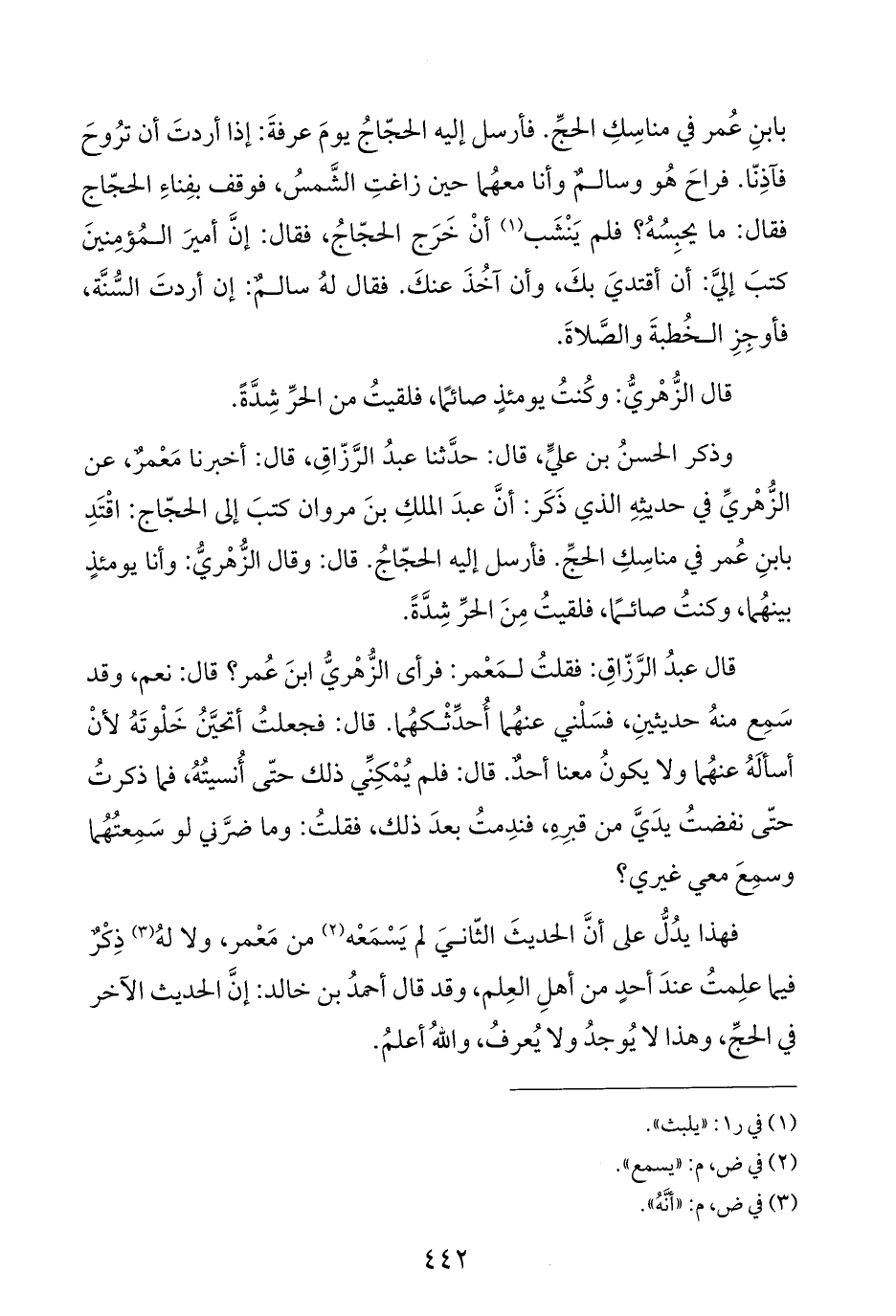 وذكر الحسنُ بن عليٍّ، قال: حدَّثنا عبدُ الرَّزّاقِ، قال: أخبرنا مَعْمرٌ، عن الزُّهْريِّ في حديثِهِ الذي ذَكَر: أنَّ عبدَ الملكِ بنَ مروان كتبَ إلى الحجّاج: اقْتَدِ بابنِ عُمر في مناسِكِ الحجِّ. فأرسل إليه الحجّاجُ. قال: وقال الزُّهْريُّ: وأنا يومئذٍ بينهُما، وكنتُ صائمًا، فلقيتُ مِنَ الحرِّ شِدَّةً.