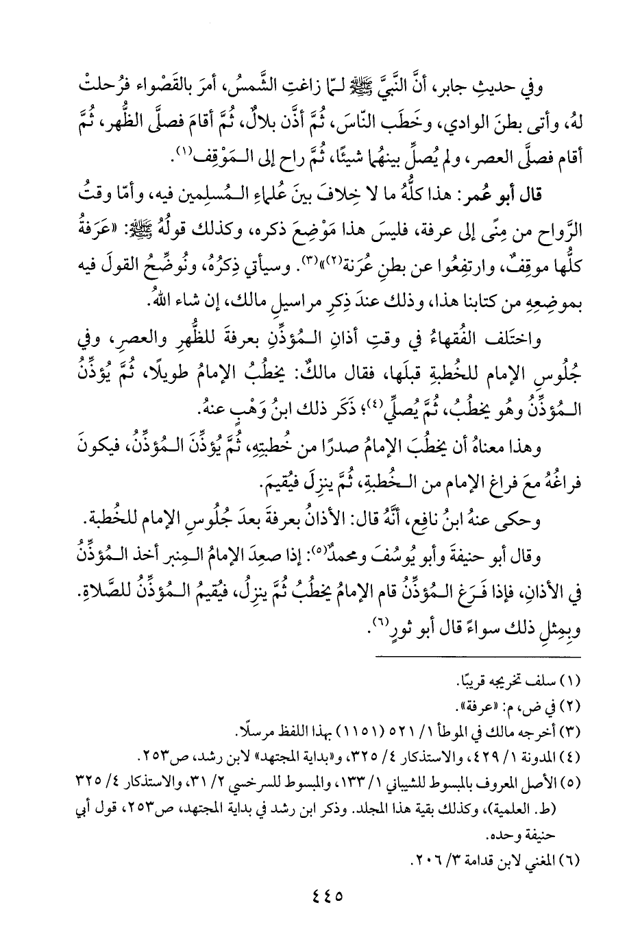قال أبو عُمر: هذا كلُّهُ ما لا خِلافَ بينَ عُلماءِ المُسلِمين فيه، وأمّا وقتُ الرَّواح من مِنًى إلى عرفة، فليسَ هذا مَوْضِعَ ذكره، وكذلك قولُهُ - صلى الله عليه وسلم -: "عَرَفةُ كلُّها موقِفٌ، وارتفِعُوا عن بطنِ عُرَنة (¬٢) " (¬٣). وسيأتي ذِكرُهُ، ونُوضِّحُ القولَ فيه بموضِعِهِ من كتابنا هذا، وذلك عندَ ذِكرِ مراسيلِ مالك، إن شاء اللهُ.