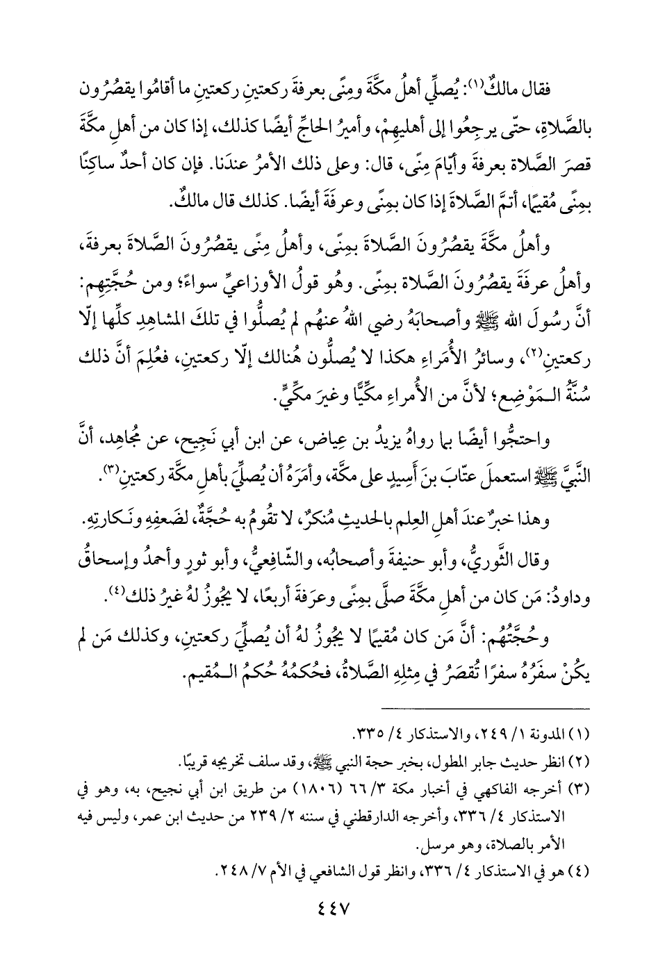 وأهلُ مكَّةَ يقصُرُونَ الصَّلاةَ بمِنًى، وأهلُ مِنًى يقصُرُونَ الصلاةَ بعرفةَ، وأهلُ عرفَةَ يقصُرُونَ الصَّلاة بمِنًى. وهُو قولُ الأوزاعيِّ سواءً؛ ومن حُجَّتِهِم: أنَّ رسُولَ الله - صلى الله عليه وسلم - وأصحابَهُ رضي اللهُ عنهُم لم يُصلُّوا في تلكَ المشاهِدِ كلِّها إلّا ركعتينِ (¬٢)، وسائرُ الأُمَراءِ هكذا لا يُصلُّون هُنالك إلّا ركعتينِ، فعُلِمَ أنَّ ذلك سُنَّةُ المَوْضِع؛ لأنَّ من الأُمراءِ مكِّيًّا وغيرَ مكِّيٍّ.