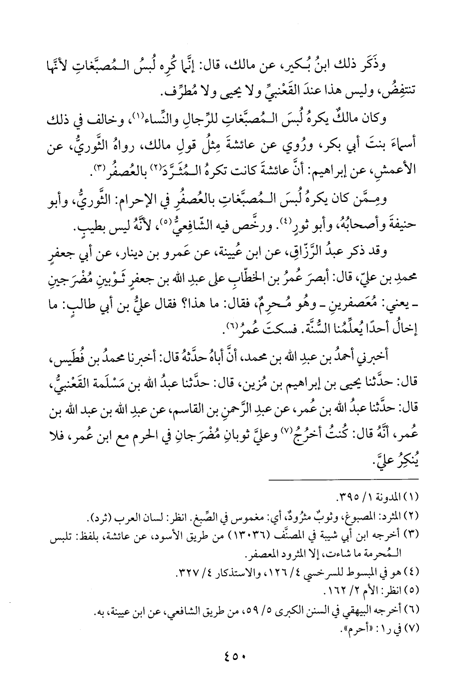 وقد ذكر عبدُ الرَّزّاقِ، عن ابن عُيينة، عن عَمرو بن دينار، عن أبي جعفرٍ محمدِ بن عليّ، قال: أبصرَ عُمرُ بن الخطّابِ على عبدِ الله بن جعفرٍ ثَوْبينِ مُضْرَجينِ - يعني: مُعَصفرينِ - وهُو مُحرِمٌ، فقال: ما هذا؟ فقال عليُّ بن أبي طالبٍ: ما إخالُ أحدًا يُعلِّمُنا السُّنَّة. فسكتَ عُمرُ (¬٦).