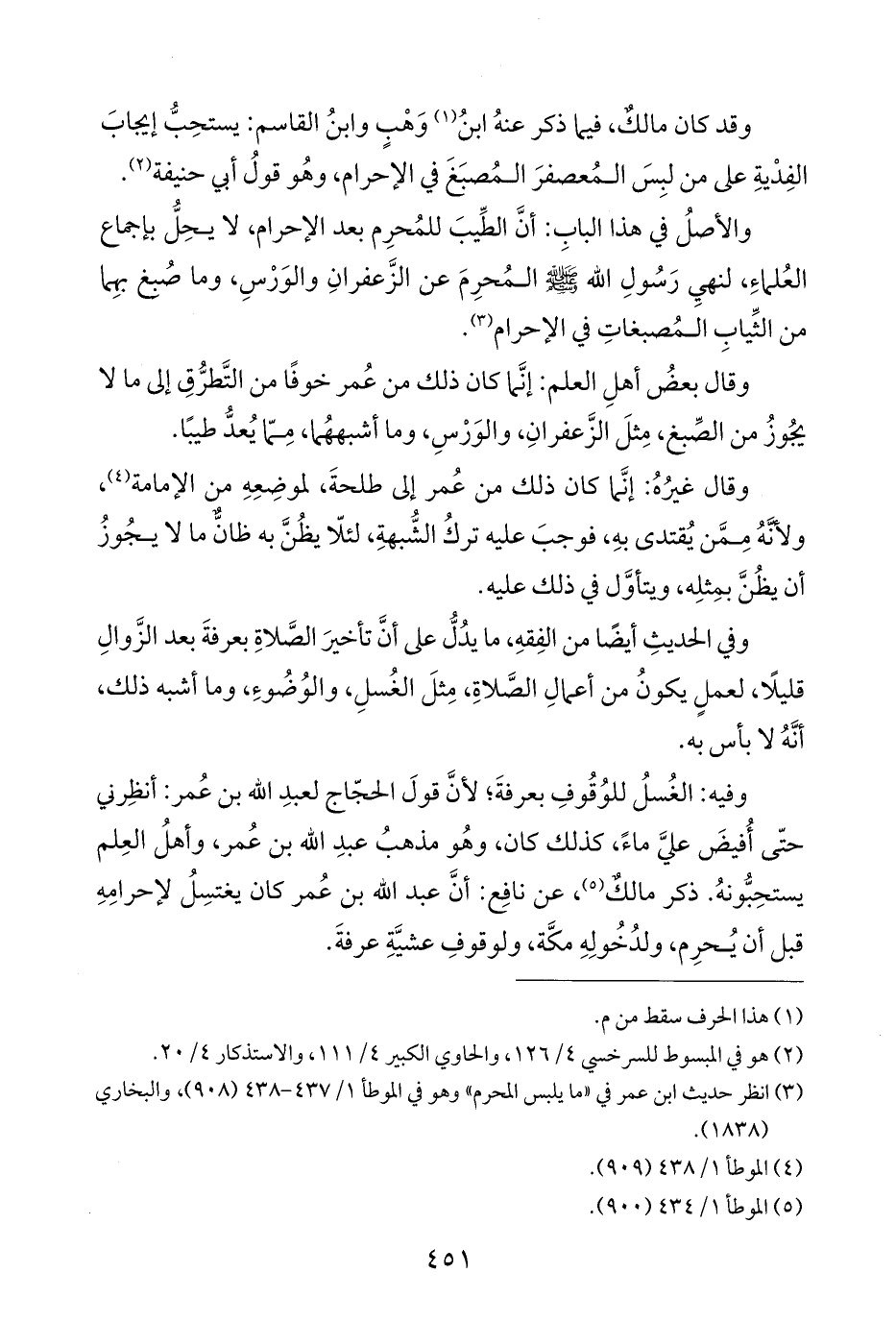 (¬٣) انظر حديث ابن عمر في "ما يلبس المحرم" وهو في الموطأ ١/ ٤٣٧ - ٤٣٨ (٩٠٨)، والبخاري (١٨٣٨).