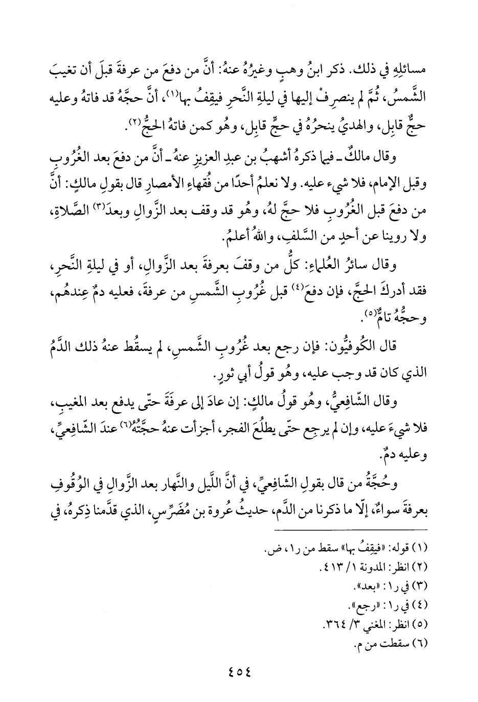 وقال مالكٌ - فيما ذكرهُ أشهبُ بن عبدِ العزيزِ عنهُ - أنَّ من دفعَ بعد الغُرُوبِ وقبل الإمام، فلا شيء عليه. ولا نعلمُ أحدًا من فُقهاءِ الأمصارِ قال بقولِ مالكٍ: أنَّ من دفعَ قبل الغُرُوبِ فلا حجَّ لهُ، وهُو قد وقف بعد الزَّوالِ وبعدَ (¬٣) الصَّلاةِ، ولا روينا عن أحدٍ من السَّلفِ، واللهُ أعلمُ.