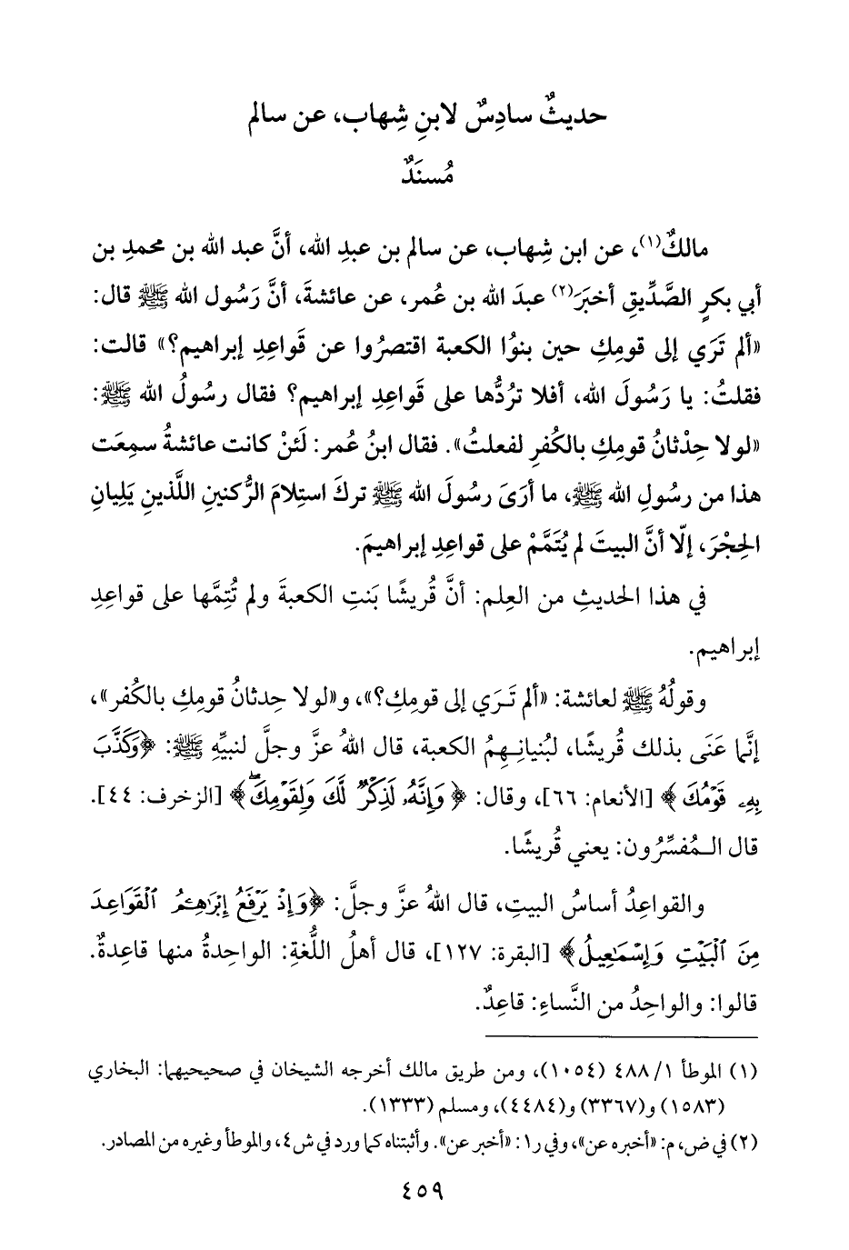 مالكٌ (¬١)، عن ابن شِهاب، عن سالم بن عبدِ الله، أنَّ عبد الله بن محمدِ بن أبي بكرٍ الصَّدِّيقِ أخبَرَ (¬٢) عبدَ الله بن عُمر، عن عائشةَ، أنَّ رَسُول الله - صلى الله عليه وسلم - قال: "ألم تري إلى قومِكِ حين بنوُا الكعبة اقتصرُوا عن قَواعِدِ إبراهيم؟ " قالت: فقلتُ: يا رَسُولَ الله، أفلا ترُدُّها على قَواعِدِ إبراهيم؟ فقال رسُولُ الله - صلى الله عليه وسلم -: "لولا حِدْثانُ قومِكِ بالكُفرِ لفعلتُ". فقال ابنُ عُمر: لَئنْ كانت عائشةُ سمِعَت هذا من رسُولِ الله - صلى الله عليه وسلم -، ما أرَىَ رسُولَ الله - صلى الله عليه وسلم - تركَ استِلامَ الرُّكنينِ اللَّذينِ يَلِيانِ الحِجْرَ، إلّا أنَّ البيتَ لم يُتَمَّمْ على قواعِدِ إبراهيمَ.