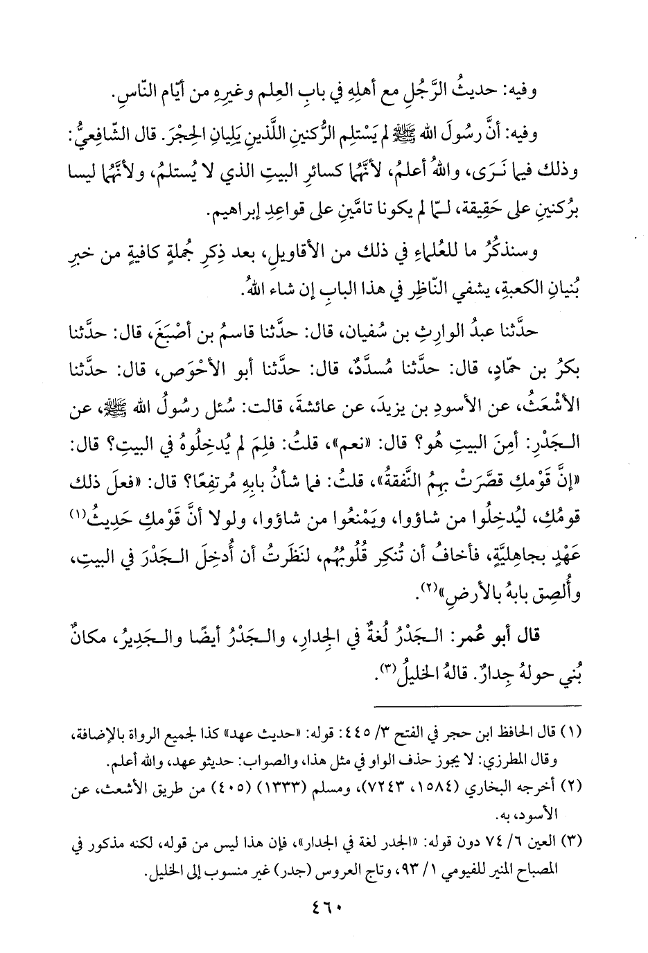 حدَّثنا عبدُ الوارِثِ بن سُفيان، قال: حدَّثنا قاسمُ بن أصْبَغَ، قال: حدَّثنا بكرُ بن حمّادٍ، قال: حدَّثنا مُسدَّ؛، قال: حدَّثنا أبو الأحْوَص، قال: حدَّثنا الأشْعَثُ، عن الأسودِ بن يزيدَ، عن عائشةَ، قالت: سُئل رسُولُ الله - صلى الله عليه وسلم -، عن الجَدْرِ: أمِنَ البيتِ هُو؟ قال: "نعم"، قلتُ: فلِمَ لم يُدخِلُوهُ في البيتِ؟ قال: "إنَّ قَوْمكِ قصَّرَتْ بهِمُ النَّفقةُ"، قلتُ: فما شأنُ بابِهِ مُرتفِعًا؟ قال: "فعلَ ذلك قومُكِ، ليُدخِلُوا من شاؤوا، ويَمْنعُوا من شاؤوا، ولولا أنَّ قَوْمكِ حَدِيثُ (¬١) عَهْدٍ بجاهِليَّةٍ، فأخافُ أن تُنكِر قُلُوبُهُم، لنَظَرتُ أن أُدخِلَ الجَدْرَ في البيتِ، وأُلصِق بابهُ بالأرضِ" (¬٢).
