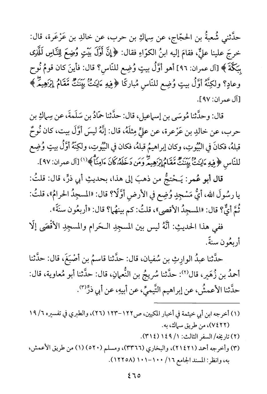 حدَّثني شُعبةُ بن الحجّاج، عن سِماكِ بن حرب، عن خالدِ بن عَرْعَرة، قال: خرجَ علينا عليٌّ، فقامَ إليه ابنُ الكوّاءِ فقال: {إِنَّ أَوَّلَ بَيْتٍ وُضِعَ لِلنَّاسِ لَلَّذِي بِبَكَّةَ} [آل عمران: ٩٦] أهو أوَّلُ بيتٍ وُضِع للنّاسِ؛ قال: فأينَ كان قومُ نُوح وعادٍ؟ ولكِنَّهُ أوَّلُ بيتٍ وُضِع للنّاسِ مُباركًا {فِيهِ آيَاتٌ بَيِّنَاتٌ مَقَامُ إِبْرَاهِيمَ} [آل عمران: ٩٧].