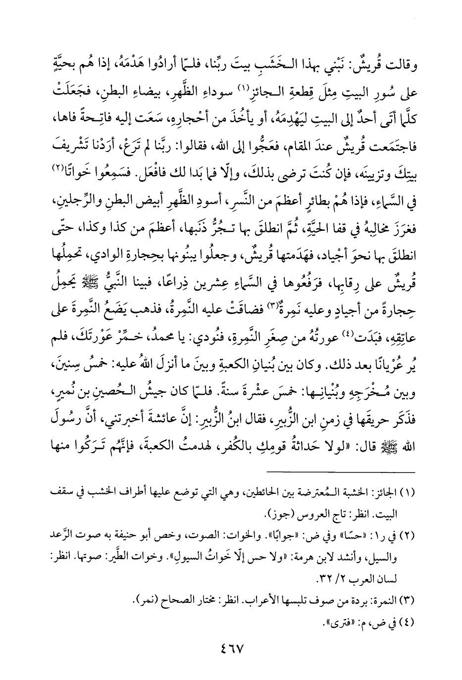 وقالت قُريشٌ: نَبْني بهذا الخَشَبِ بيتَ ربِّنا، فلمّا أرادُوا هَدْمَهُ، إذا هُم بحيَّةٍ على سُورِ البيتِ مِثلَ قِطعةِ الجائزِ (¬١) سوداءِ الظَّهرِ، بيضاءِ البطنِ، فجَعَلَتْ كلَّما أتَى أحدٌ إلى البيتِ ليَهْدِمَهُ، أو يأخُذَ من أحْجارِهِ، سَعَت إليه فاتِحةً فاها، فاجتَمَعت قُريش عندَ المقام، فعَجُّوا إلى الله، فقالوا: ربَّنا لم تَرَعْ، أرَدْنا تَشْريفَ بيتِكَ وتزيينَه، فإن كُنتَ ترضى بذلكَ، وإلّا فما بَدا لك فافْعَل. فسَمِعُوا خَواتًا (¬٢) في السَّماءِ، فإذا هُمْ بطائرٍ أعظمَ من النَّسرِ، أسودِ الظَّهرِ أبيض البطنِ والرِّجلينِ، فغرَزَ مخالِبهُ في قفا الحيَّةِ، ثُمَّ انطلقَ بها تجُرُّ ذَنَبها، أعظمَ من كذا وكذا، حتّى انطلقَ بها نحوَ أجْياد، فهَدَمتها قُريشٌ، وجعلُوا يبنُونها بحِجارةِ الوادي، تحمِلُها قُريشٌ على رِقابِها، فرَفُعُوها في السَّماءِ عِشرين ذِراعًا، فبينا النَّبيُّ - صلى الله عليه وسلم - يحمِلُ حِجارةً من أجيادٍ وعليه نَمِرةٌ (¬٣) فضاقَتْ عليه النَّمِرةُ، فذهب يَضَعُ النَّمِرةَ على عاتِقِهِ، فبَدَت (¬٤) عورتُهُ من صِغَرِ النَّمِرةِ، فنُودي: يا محمدُ، خمِّرْ عَوْرتَكَ، فلم يُر عُرْيانًا بعد ذلك. وكان بين بُنيانِ الكعبةِ وبينَ ما أنزلَ اللهُ عليه: خمسُ سِنينَ، وبين مُخْرَجِهِ وبُنْيانِها: خمسَ عشْرةَ سنةً. فلمّا كان جيشُ الحُصينِ بن نُميرٍ، فذَكَر حريقَها في زمنِ ابن الزُّبيرِ، فقال ابنُ الزُّبيرِ: إنَّ عائشةَ أخبرتني، أنَّ رسُولَ الله - صلى الله عليه وسلم - قال: "لولا حَداثةُ قومِكِ بالكُفر، لهدمتُ الكعبةَ، فإنَّهُم تَرَكُوا منها
