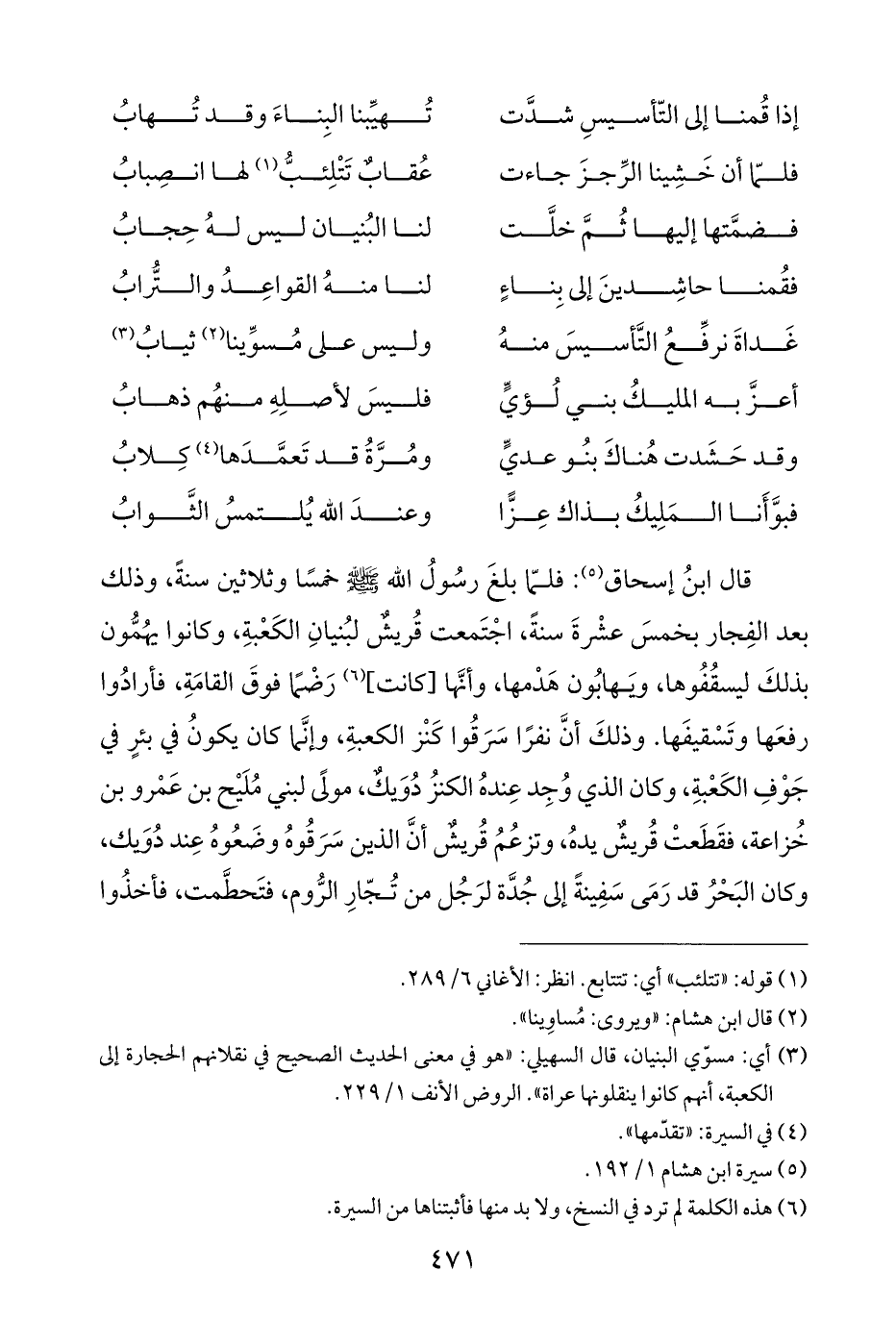 (¬٣) أي: مسوّي البنيان، قال السهيلي: "هو في معنى الحديث الصحيح في نقلانهم الحجارة إلى الكعبة، أنهم كانوا ينقلونها عراة". الروض الأنف ١/ ٢٢٩.