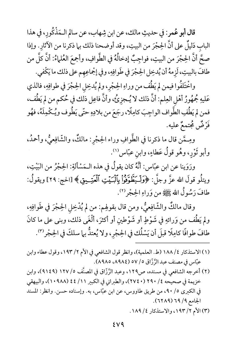 قال أبو عُمر: في حديثِ مالك، عن ابن شِهاب، عن سالم المَذْكُورِ، في هذا البابِ دَليلٌ على أنَّ الحِجْرَ من البيتِ، وقد أوضحنا ذلك بما ذكرنا من الآثارِ. وإذا صحَّ أنَّ الحِجْرَ من البيتِ، فواجِبٌ إدخالُهُ في الطَّوافِ، وأجمعَ العُلماءُ: أنَّ كلَّ من طافَ بالبيتِ، لَزِمهُ أن يُدخِل الحِجْرَ في طَوافِهِ، وفي إجْماعِهِم على ذلك ما يَكْفي.