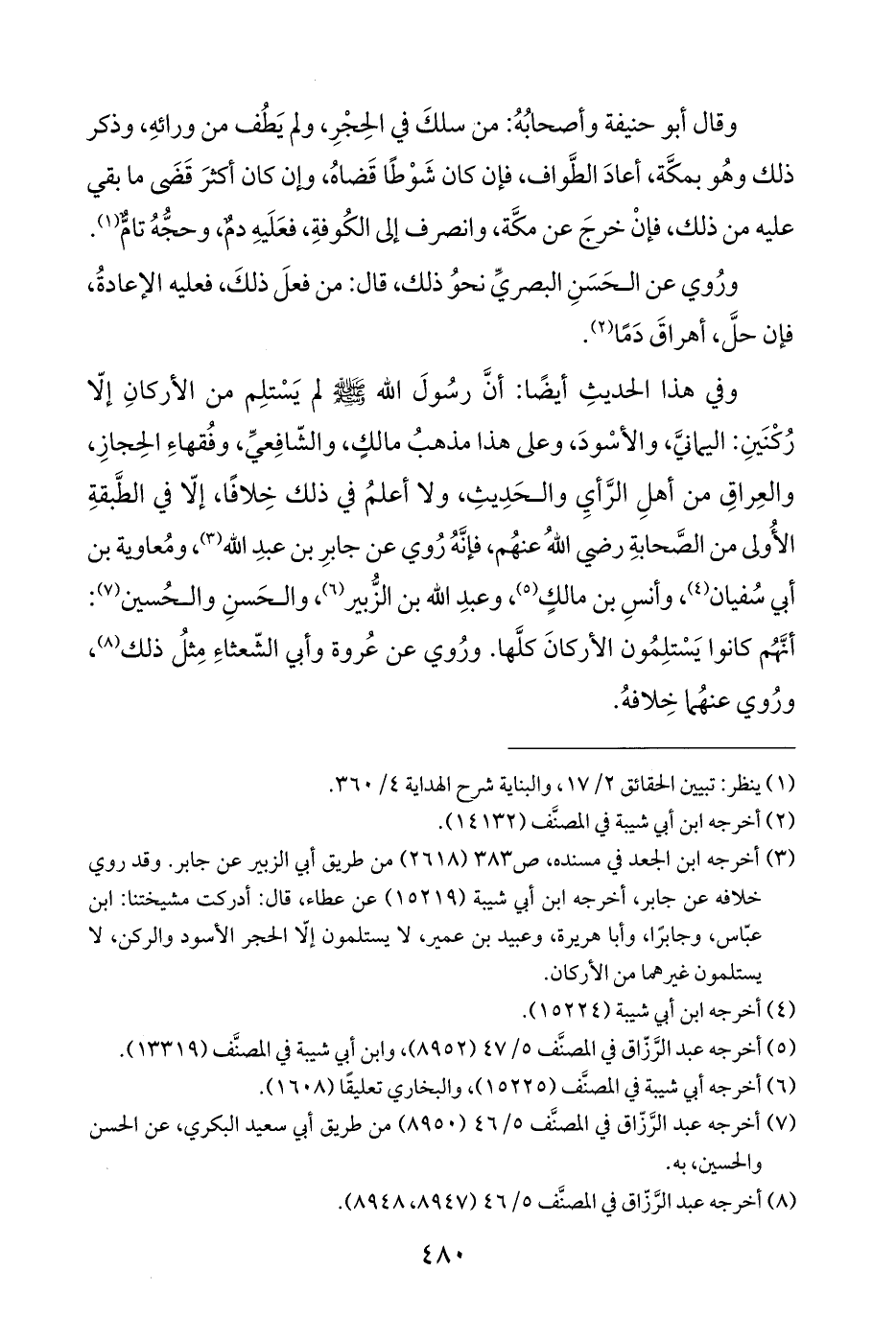 (¬٣) أخرجه ابن الجعد في مسنده، ص ٣٨٣ (٢٦١٨) من طريق أبي الزبير عن جابر. وقد روي خلافه عن جابر، أخرجه ابن أبي شيبة (١٥٢١٩) عن عطاء، قال: أدركت مشيختنا: ابن عبّاس، وجابرًا، وأبا هريرة، وعبيد بن عمير، لا يستلمون إلّا الحجر الأسود والركن، لا يستلمون غيرهما من الأركان.