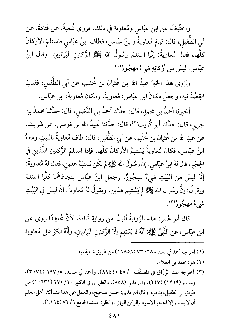 أخبرنا أحمدُ بن محمدٍ، قال: حدَّثنا أحمدُ بن الفَضْلِ، قال: حدَّثنا محمدُ بن جريرٍ، قال: حدَّثنا أبو كُريب (¬٢)، قال: حدَّثنا عُبيدُ الله بن مُوسى، عن شَريك، عن عبدِ الله بن عُثمان بن خُثَيم، عن أبي الطُّفيل، قال: طاف مُعاويةُ بالبيتِ ومعهُ ابنُ عبّاس، فكان مُعاويةُ يَسْتلِمُ الأركانَ كلَّها، فإذا استلمَ الرُّكنينِ اللَّذينِ في الحِجْرِ، قال لهُ ابنُ عبّاسٍ: إنَّ رسُولَ الله - صلى الله عليه وسلم - لم يكُن يَسْتلِمُ هذينِ، فقال لهُ مُعاويةُ: إنَّهُ ليسَ من البَيْتِ شيءٌ مهجُورٌ. وجعل ابنُ عبّاس يتجافاهُما كلَّما استلمَ ويقولُ: إنَّ رسُول الله - صلى الله عليه وسلم - لم يَسْتلِم هذين، ويقولُ لهُ مُعاويةُ: أنْ ليسَ في البَيْتِ شيءٌ مهجُورٌ (¬٣).