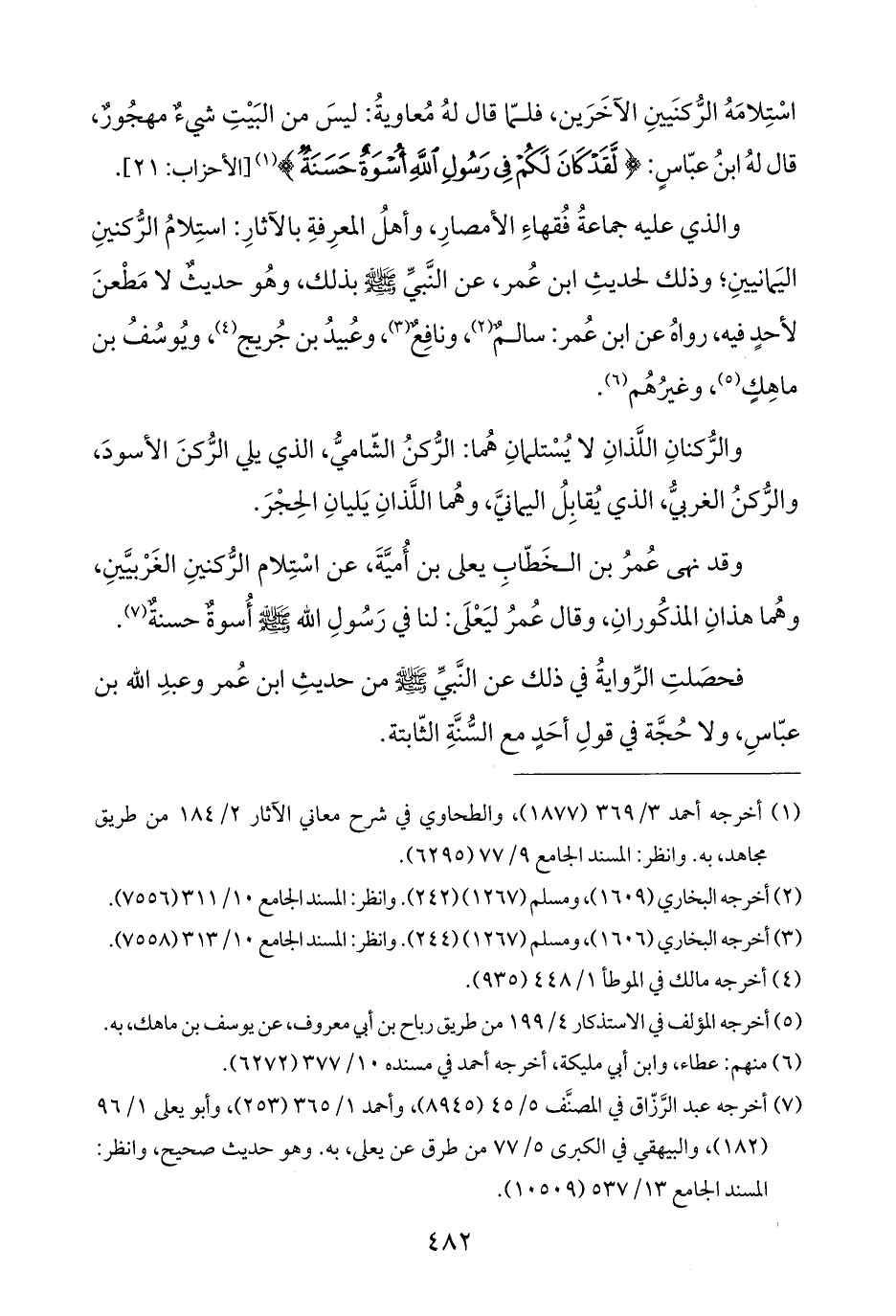 اسْتِلامَهُ الرُّكنَيينِ الآخَرَين، فلمّا قال لهُ مُعاويةُ: ليسَ من البَيْتِ شيءٌ مهجُورٌ، قال لهُ ابنُ عبّاسٍ: {لَقَدْ كَانَ لَكُمْ فِي رَسُولِ اللَّهِ أُسْوَةٌ حَسَنَةٌ} (¬١) [الأحزاب: ٢١].
