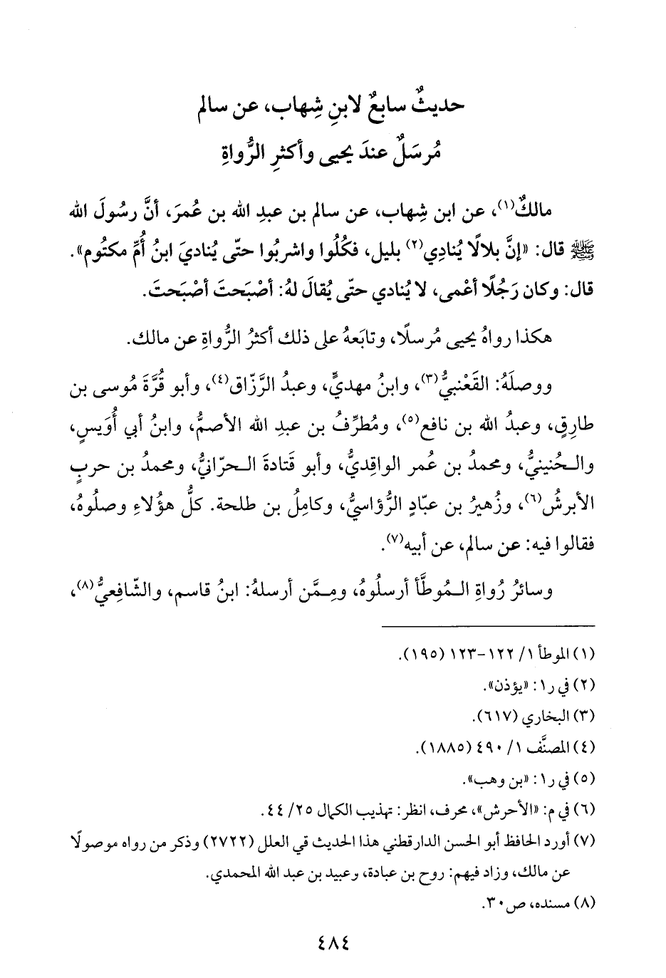 حديثٌ سابعٌ لابنِ شِهاب، عن سالم مُرسَلٌ عندَ يحيى وأكثرِ الرُّواةِ
