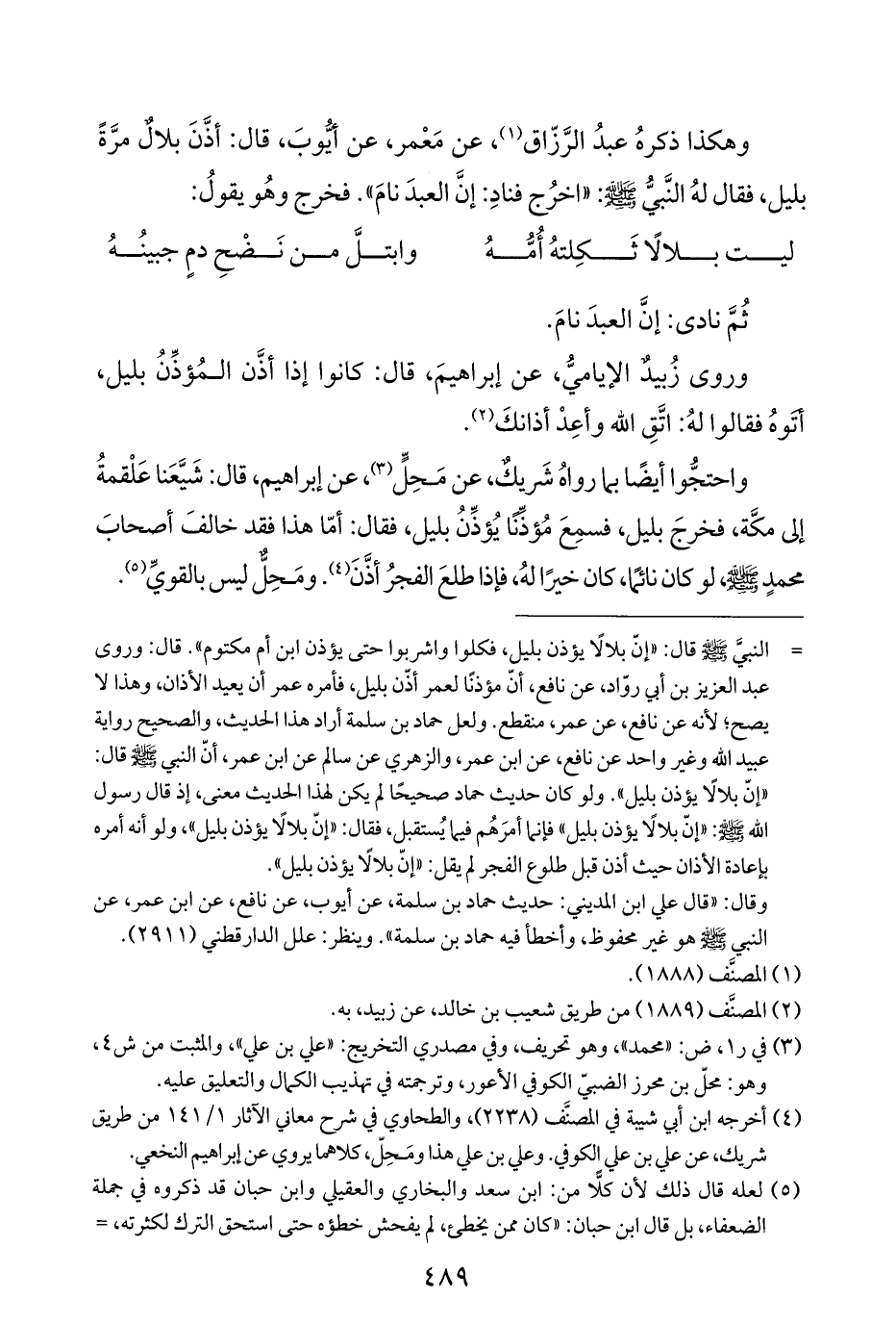 = النبيَّ - صلى الله عليه وسلم - قال: "إنّ بلالًا يؤذن بليل، فكلوا واشربوا حتى يؤذن ابن أم مكتوم". قال: وروى عبد العزيز بن أبي روّاد، عن نافع، أنّ مؤذنًا لعمر أذّن بليل، فأمره عمر أن يعيد الأذان، وهذا لا يصح، لأنه عن نافع، عن عمر، منقطع. ولعل حماد بن سلمة أراد هذا الحديث، والصحيح رواية عبيد الله وغير واحد عن نافع، عن ابن عمر، والزهري عن سالم عن ابن عمر، أنّ النبي - صلى الله عليه وسلم - قال: "إنّ بلالًا يؤذن بليل". ولو كان حديث حماد صحيحًا لم يكن لهذا الحديث معنى، إذ قال رسول الله - صلى الله عليه وسلم -: "إنّ بلالًا يؤذن بليل" فإنما أمرَهُم فيما يُستقبل، فقال: "إنّ بلالًا يؤذن بليل"، ولو أنه أمره بإعادة الأذان حيث أذن قبل طلوع الفجر لم يقل: "إنّ بلالًا يؤذن بليل".