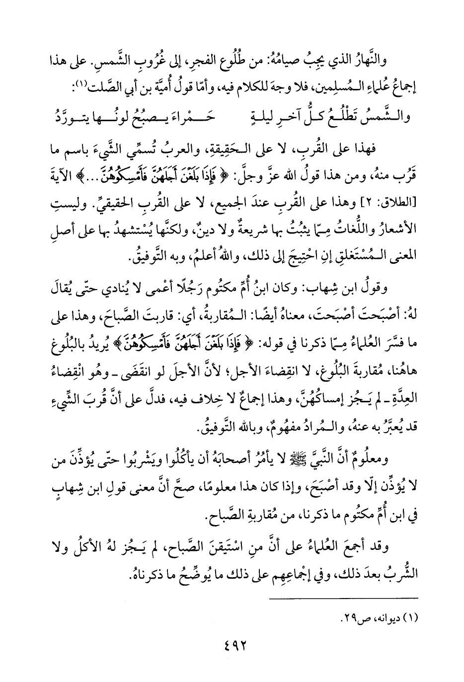 والنَّهارُ الذي يجِبُ صيامُهُ: من طُلُوع الفجرِ، إلى غُرُوبِ الشَّمسِ. على هذا إجماعُ عُلماءِ المُسلِمين، فلا وجهَ للكلام فيه، وأمّا قولُ أُميَّة بن أبي الصَّلت (¬١):