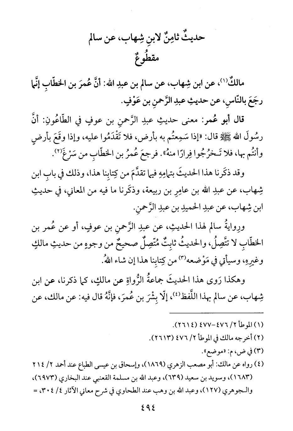 مالكٌ (¬١)، عن ابن شِهاب، عن سالم بن عبدِ الله: أنَّ عُمرَ بن الخطّابِ إنَّما رجَعَ بالنّاسِ، عن حديثِ عبدِ الرَّحمنِ بن عَوْفٍ.