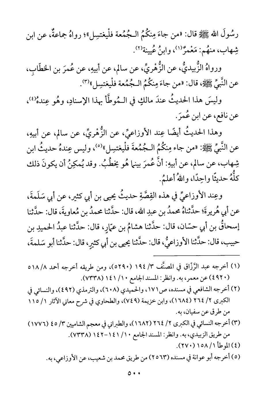 وهذا الحديثُ أيضًا عِند الأوزاعيِّ، عن الزُّهْريِّ، عن سالم، عن أبيهِ، عن النَّبيِّ - صلى الله عليه وسلم -: "من جاء مِنكُمُ الجُمُعةَ فلْيغتسِل" (¬٥)، وليس عِندهُ حديثُ ابن شِهاب، عن سالم، عن أبيهِ: أنَّ عُمرَ بينما هُو يخطُبُ. وقد يُمكِنُ أن يكونَ ذلك كلُّهُ حديثًا واحِدًا، واللهُ أعلمُ.