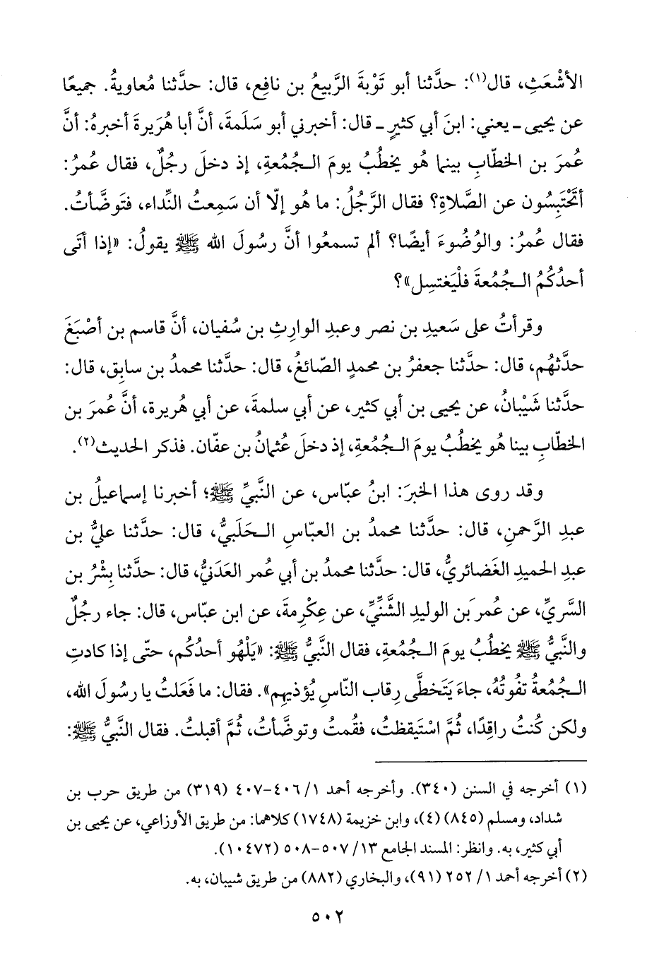 وقرأتُ على سَعيدِ بن نصر وعبدِ الوارِثِ بن سُفيان، أنَّ قاسم بن أصْبَغَ حدَّثهُم، قال: حدَّثنا جعفرُ بن محمدٍ الصّائغُ، قال: حدَّثنا محمدُ بن سابِق، قال: حدَّثنا شَيْبانُ، عن يحيى بن أبي كثير، عن أبي سلمةَ، عن أبي هُريرة، أنَّ عُمرَ بن الخطّابِ بينا هُو يخطُبُ يومَ الجُمُعةِ، إذ دخلَ عُثمانُ بن عفّان. فذكر الحديث (¬٢).