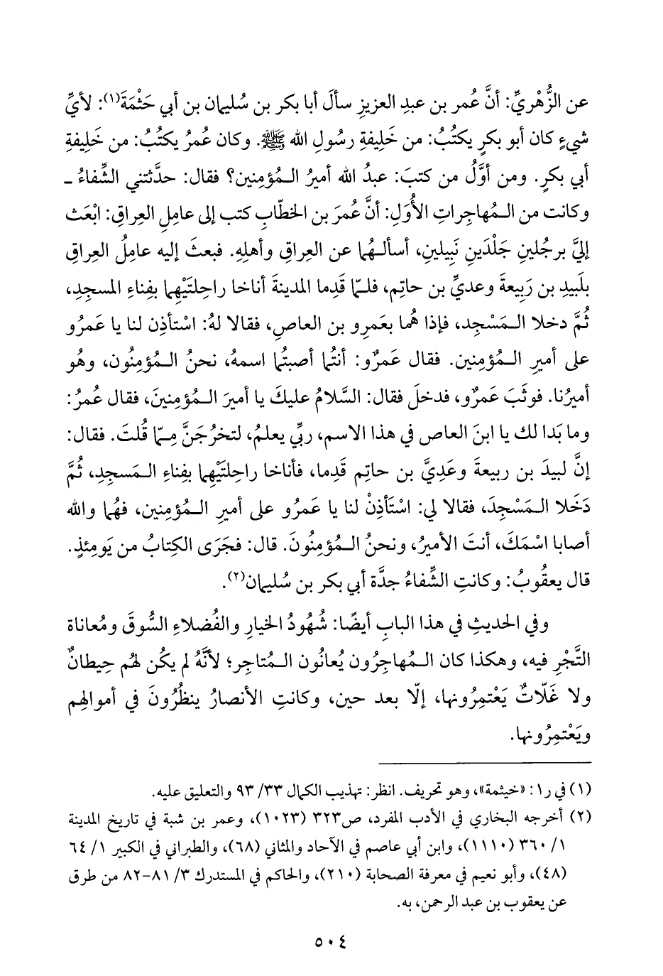 عن الزُّهْريِّ: أنَّ عُمر بن عبدِ العزيزِ سألَ أبا بكر بن سُليمان بن أبي حَثْمَةَ (¬١): لأيِّ شيءٍ كان أبو بكرٍ يكتُبُ: من خَلِيفةِ رسُولِ الله - صلى الله عليه وسلم -. وكان عُمرُ يكتُبُ: من خَلِيفةِ أبي بكرٍ. ومن أوَّلُ من كتبَ: عبدُ الله أميرُ المُؤمِنين؟ فقال: حدَّثتني الشِّفاءُ - وكانت من المُهاجِراتِ الأُوَلِ: أنَّ عُمرَ بن الخطّاب كتب إلى عامِلِ العِراقِ: ابْعَث إليَّ برجُلينِ جَلْدَينِ نَبِيلينِ، أسألهُما عن العِراقِ وَأهلِهِ. فبعثَ إليه عامِلُ العِراقِ بلَبيدِ بن رَبِيعةَ وعديِّ بن حاتِم، فلمّا قَدِما المدينةَ أناخا راحِلتَيْهِما بفِناءِ المسجِدِ، ثُمَّ دخلا المَسْجِد، فإذا هُما بعَمرِو بن العاصِ، فقالا لهُ: استأذِن لنا يا عَمرُو على أميرِ المُؤمِنين. فقال عَمرٌو: أنتُما أصبتُما اسمهُ، نحنُ المُؤمِنُون، وهُو أميرُنا. فوثَبَ عَمرٌو، فدخلَ فقال: السَّلامُ عليكَ يا أميرَ المُؤمِنينَ، فقال عُمرُ: وما بَدا لك يا ابنَ العاص في هذا الاسم، ربِّي يعلمُ، لتخرُجَنَّ مِمّا قُلتَ. فقال: إنَّ لبيدَ بن ربيعةَ وعَدِيَّ بن حاتِم قَدِما، فأناخا راحِلتَيْهِما بفِناءِ المَسجِدِ، ثُمَّ دَخَلا المَسْجِدَ، فقالا لي: اسْتَأذِنْ لنا يا عَمرُو على أميرِ المُؤمِنين، فهُما والله أصابا اسْمَكَ، أنتَ الأميرُ، ونحنُ المُؤمِنُونَ. قال: فجَرَى الكِتابُ من يَومِئذٍ. قال يعقُوبُ: وكانتِ الشِّفاءُ جدَّة أبي بكر بن سُليمان (¬٢).