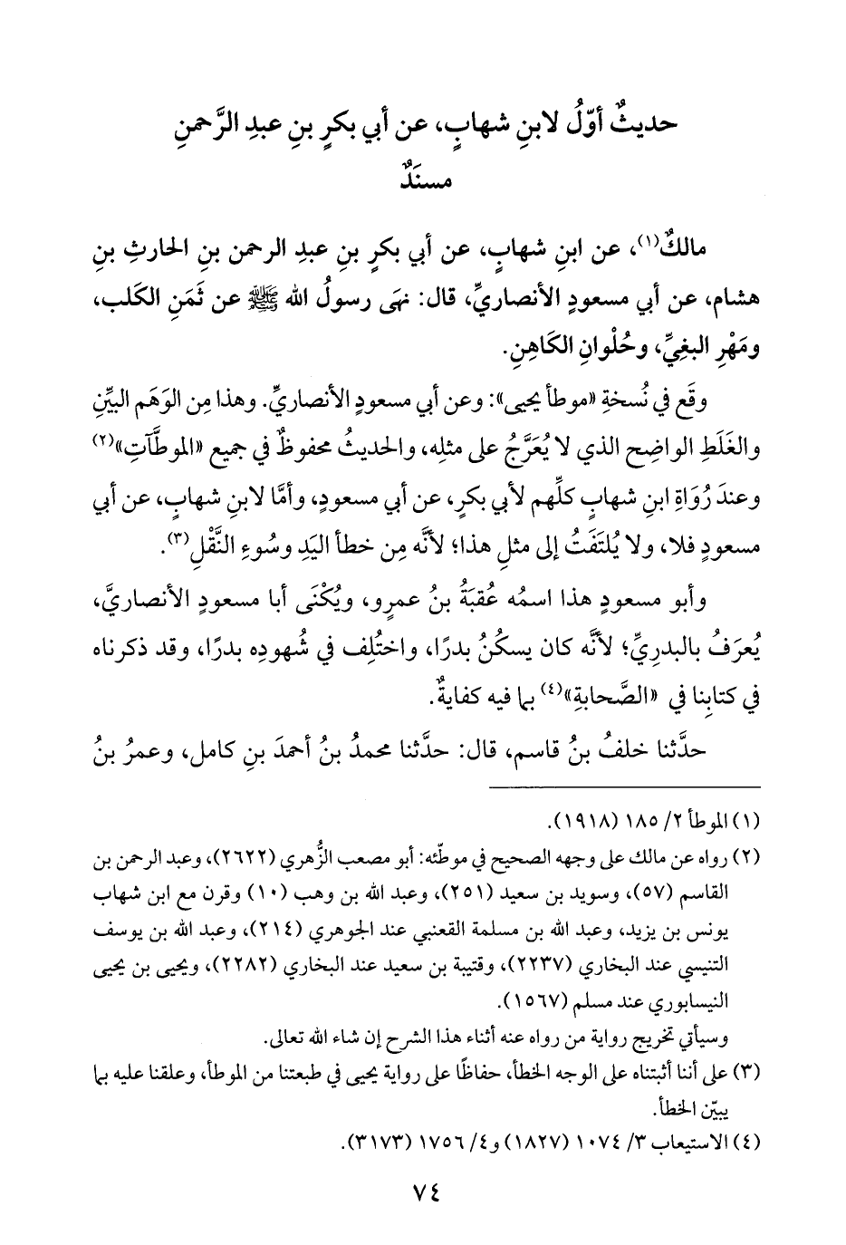 مالكٌ (¬١)، عن ابنِ شهابٍ، عن أبي بكرٍ بنِ عبدِ الرحمن بنِ الحارثِ بنِ هشام، عن أبي مسعودٍ الأنصاريِّ، قال: نهَى رسولُ الله - صلى الله عليه وسلم - عن ثَمَنِ الكَلب، ومَهْرِ البغِيِّ، وحُلْوانِ الكَاهِنِ.