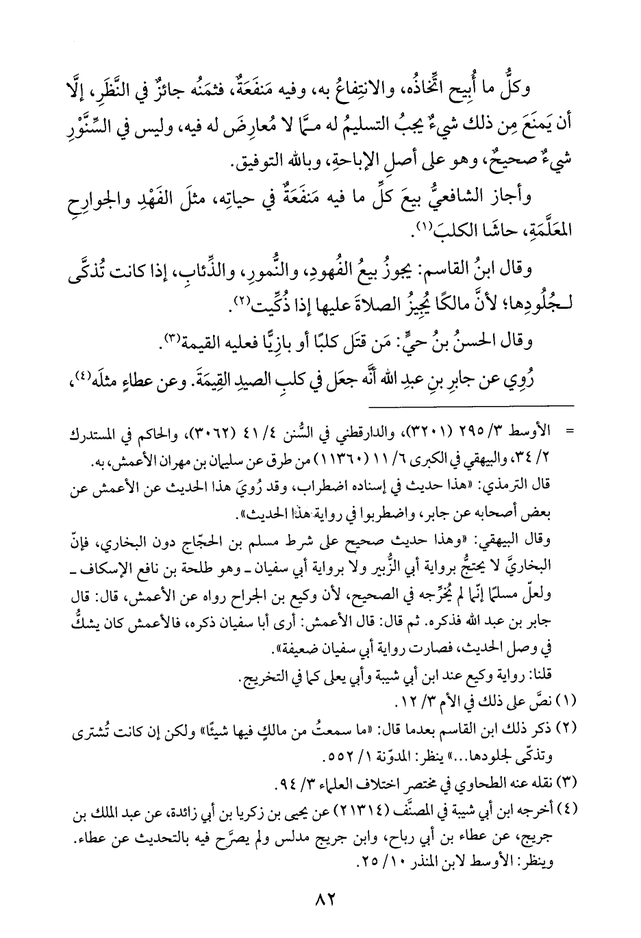 وكلُّ ما أُبِيح اتِّخاذُه، والانتِفاعُ به، وفيه مَنفَعَةٌ، فثمَنُه جائزٌ في النَّظَرِ، إلَّا أن يَمنَعَ مِن ذلك شيءٌ يجبُ التسليمُ له ممَّا لا مُعارِضَ له فيه، وليس في السِّنَّوْرِ شيءٌ صحيحٌ، وهو على أصلِ الإباحةِ، وبالله التوفيق.