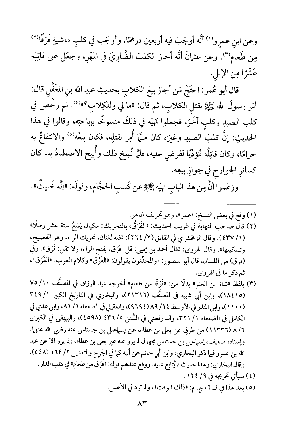 وعن ابنِ عمرٍو (¬١) أنَّه أوجَبَ فيه أربعين درهمًا، وأوجَب في كلبِ ماشيةٍ فَرَقًا (¬٢) مِن طَعام (¬٣). وعن عثمانَ أنَّه أجاز الكلبَ الضَّاريَ في المهْرِ، وجعَل على قاتِلِه عَشْرًا مِن الإبلِ.