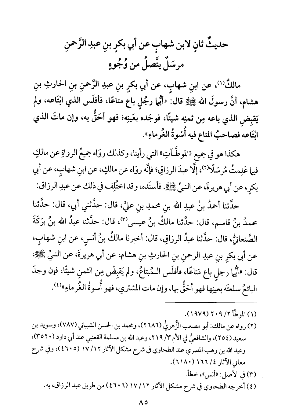 (¬٢) رواه عن مالك: أبو مصعب الزُّهريُّ (٢٦٨٦)، ومحمد بن الحسن الشيباني (٧٨٧)، وسويد بن سعيد (٢٥٤)، والشافعيُّ في الأم ٣/ ٢١٩، وعبد الله بن مسلمة القعنبي عند أبي داود (٣٥٢٠)، وعبد الله بن وهب المصري عند الطحاوي في شرح مشكل الآثار ١٢/ ١٧ (٤٦٠٥)، وفي شرح معاني الآثار ٤/ ١٦٦ (٦١٨٠).