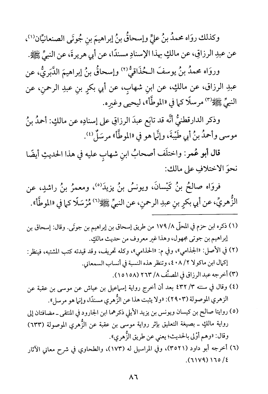 وروَاه محمدُ بنُ يوسفَ الحُذَاقيُّ (¬٢) وإسحاقُ بنُ إبراهيمَ الدَّبَريُّ، عن عبدِ الرزاق، عن مالكٍ، عن ابنِ شهابٍ، عن أبي بكرٍ بنِ عبدِ الرحمنِ، عن النبيِّ - صلى الله عليه وسلم - (¬٣) مرسلًا كما في "الموطَّأ"، ليحيى وغيرِه.
