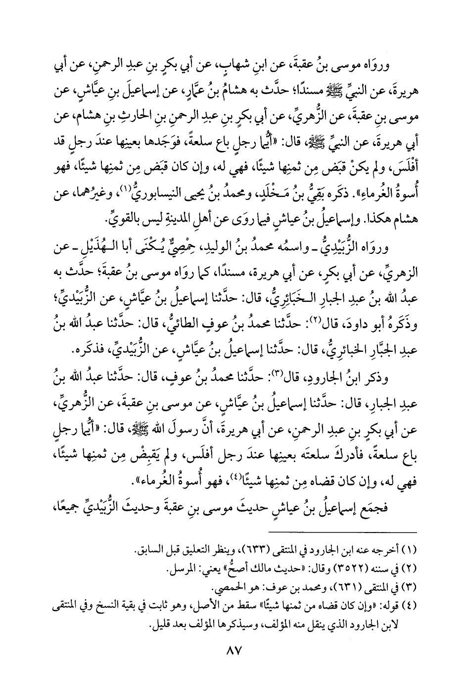 وذكر ابنُ الجارودِ، قال (¬٣): حدَّثنا محمدُ بنُ عوفٍ، قال: حدَّثنا عبدُ الله بنُ عبدِ الجبارِ، قال: حدَّثنا إسماعيلُ بنُ عيَّاشٍ، عن موسى بنِ عقبةَ، عن الزُّهريِّ، عن أبي بكرٍ بنِ عبدِ الرحمنِ، عن أبي هريرةَ، أنَّ رسولَ الله - صلى الله عليه وسلم -، قال: "أيُّما رجلٍ باع سلعةً، فأدركَ سلعتَه بعينِها عندَ رجل أفلَس، ولم يَقبِضْ مِن ثمنِها شيئًا، فهي له، وإن كان قضاه مِن ثمنِها شيئًا (¬٤)، فهو أُسوةُ الغُرماء".