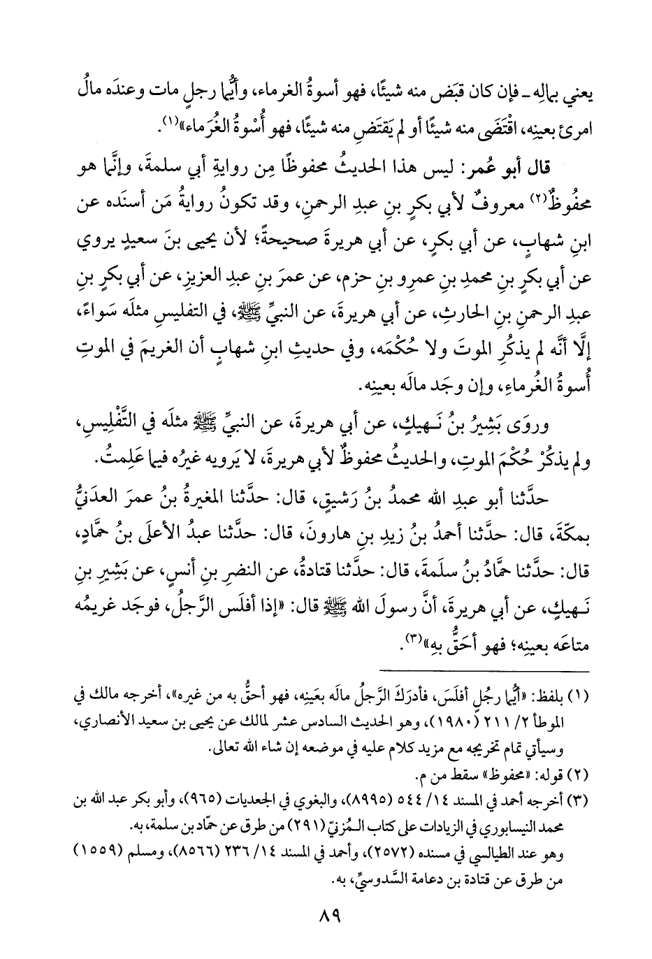 (¬١) بلفظ: "أيُّما رجُلٍ أفلَسَ، فأدرَكَ الرَّجلُ مالَه بعَينِه، فهو أحقُّ به من غيره"، أخرجه مالك في الموطأ ٢/ ٢١١ (١٩٨٠)، وهو الحديث السادس عشر لمالك عن يحيى بن سعيد الأنصاري، وسيأتي تمام تخريجه مع مزيد كلام عليه في موضعه إن شاء الله تعالى.
