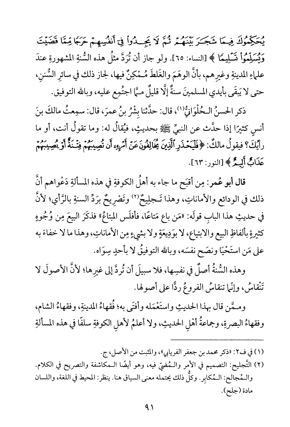 يُحَكِّمُوكَ فِيمَا شَجَرَ بَيْنَهُمْ ثُمَّ لَا يَجِدُوا فِي أَنْفُسِهِمْ حَرَجًا مِمَّا قَضَيْتَ وَيُسَلِّمُوا تَسْلِيمًا} [النساء: ٦٥]. ولو جاز أن تردَّ مثلُ هذه السُّنةِ المشهورةِ عندَ علماءِ المدينةِ وغيرِهم، بأنَّ الوهَمَ والغَلطَ مُمْكِنٌ فيها، لجاز ذلك في سائرِ السُّننِ، حتى لا يَبقَى بأيدي المسلمينَ سنةٌ إلَّا قليلٌ ممَّا اجتُمِع عليه، وبالله التوفيق.