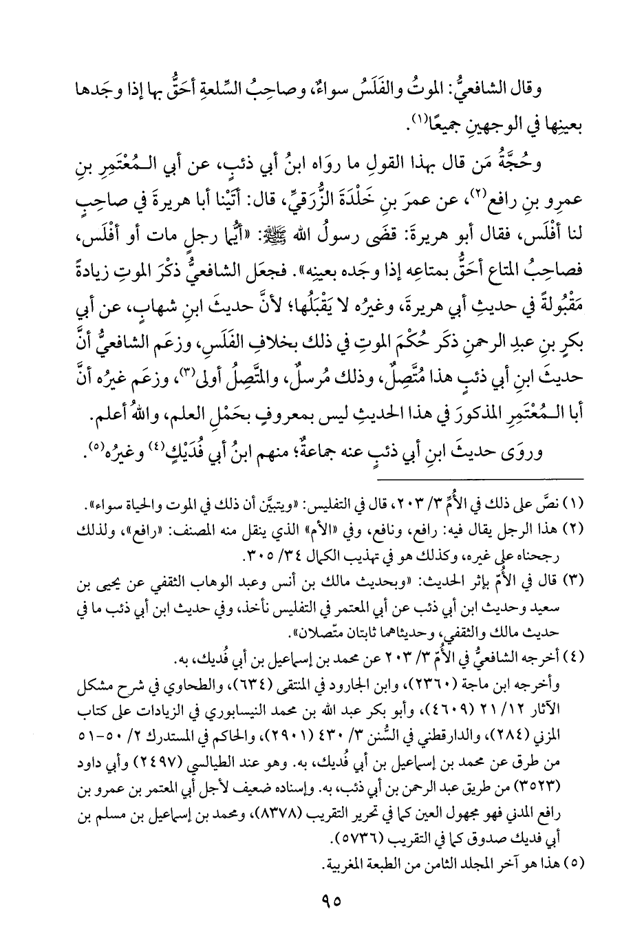 (¬٣) قال في الأمّ بإثر الحديث: "وبحديث مالك بن أنس وعبد الوهاب الثقفي عن يحيى بن سعيد وحديث ابن أبي ذئب عن أبي المعتمر في التفليس نأخذ، وفي حديث ابن أبي ذئب ما في حديث مالك والثقفي، وحديثاهما ثابتان متّصلان".